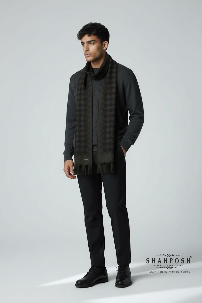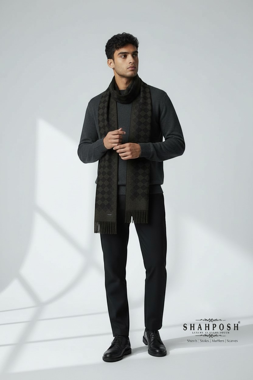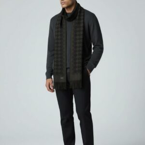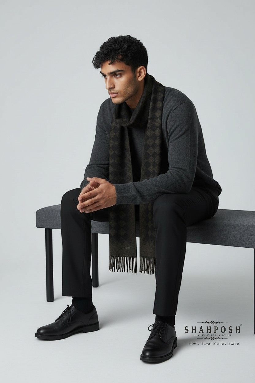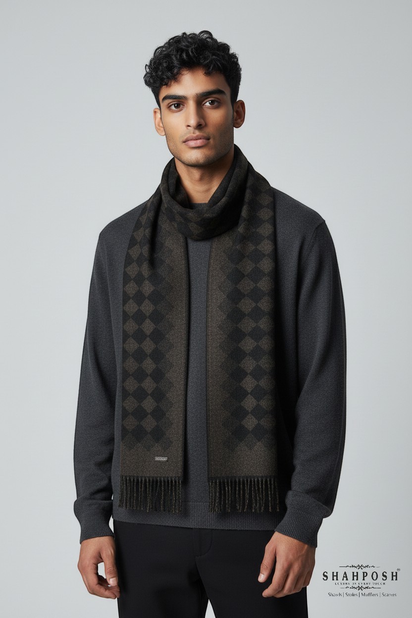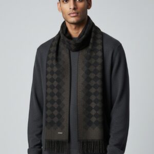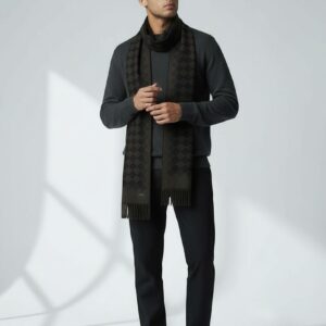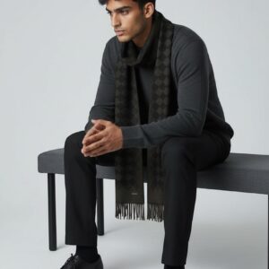 A distinguished Charcoal Grey Pashmina Woolen Muffler in a deep burgundy hue features a subtle yet sophisticated herringbone weave. The rich color offers a touch of refined elegance, while the classic pattern adds depth and visual interest. A delicate, almost black fringe finishes the ends, providing a subtle textural contrast.