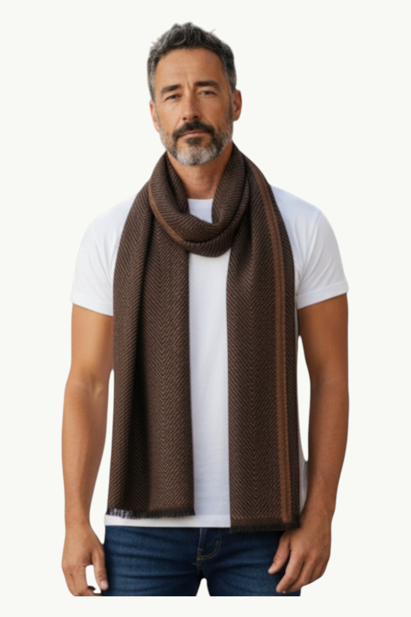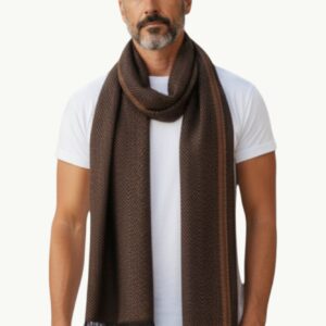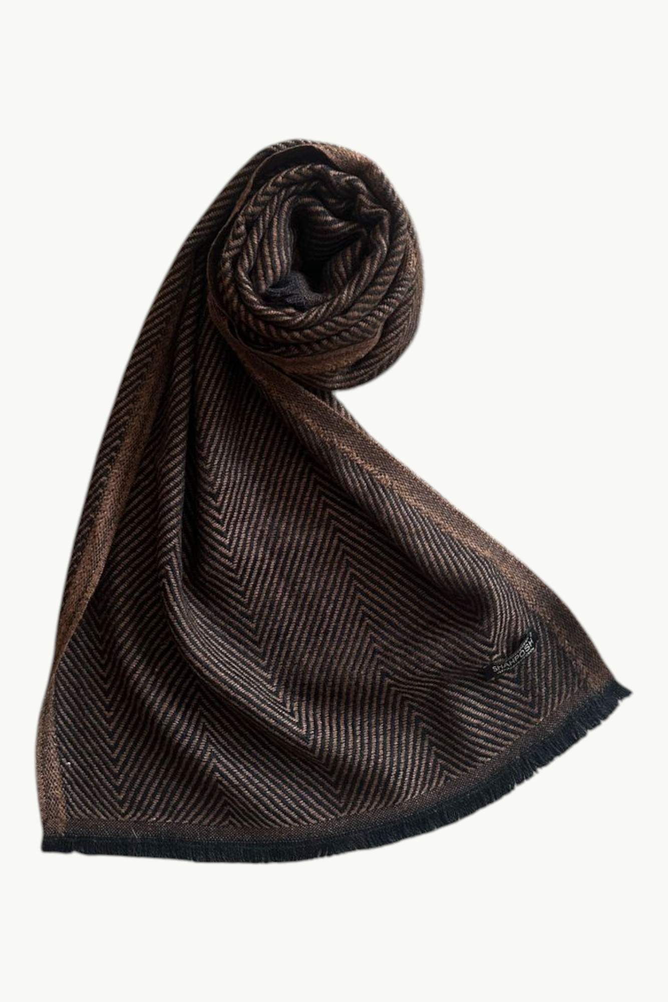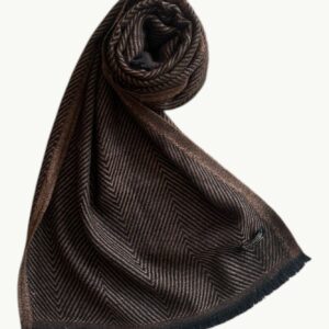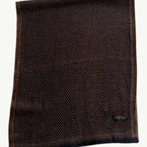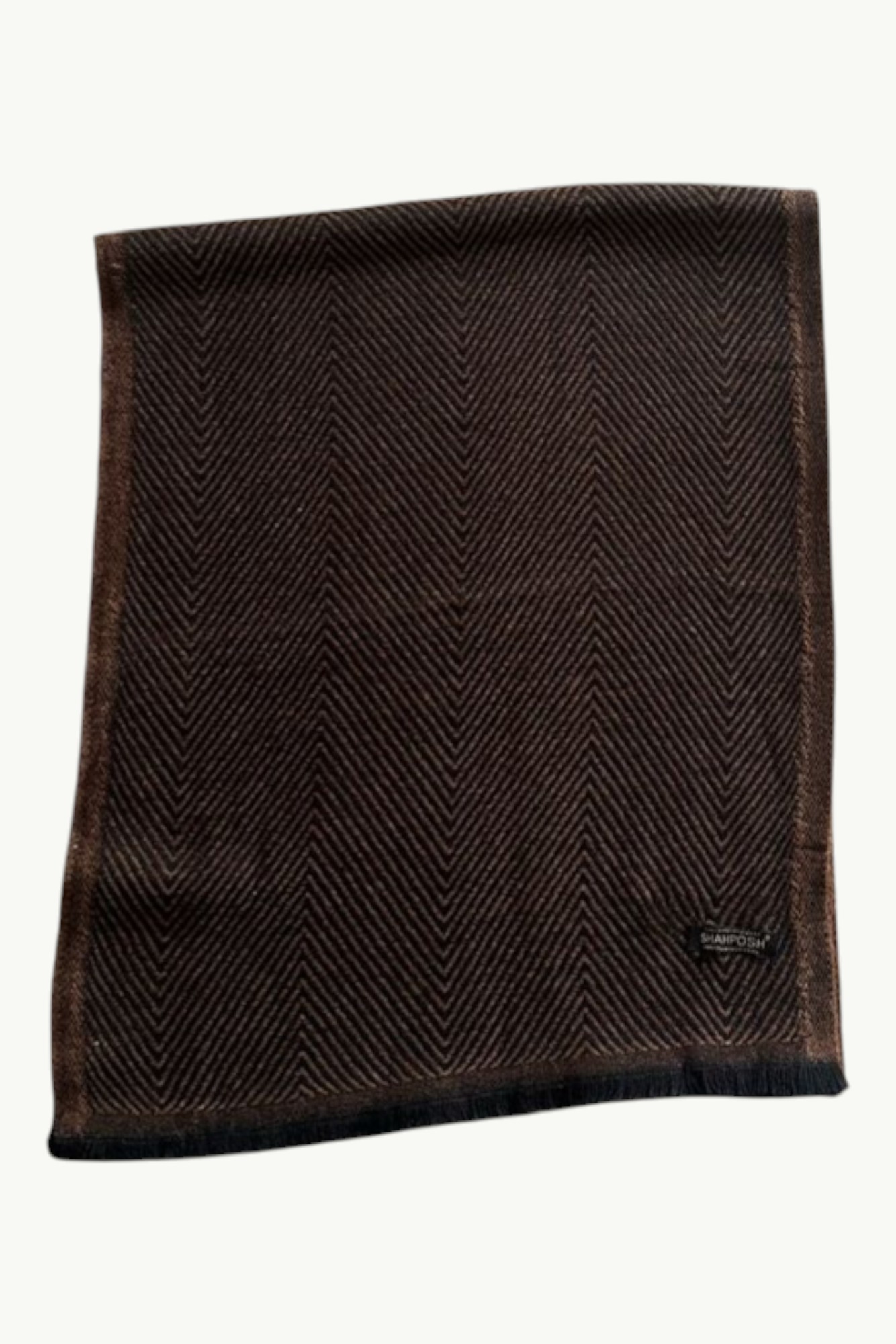 A luxuriously textured Shahposh Muffler in hue features a subtle yet sophisticated herringbone weave. The rich color offers a touch of refined elegance, while the classic pattern adds depth and visual interest. A delicate, almost black fringe finishes the ends, providing a subtle textural contrast.