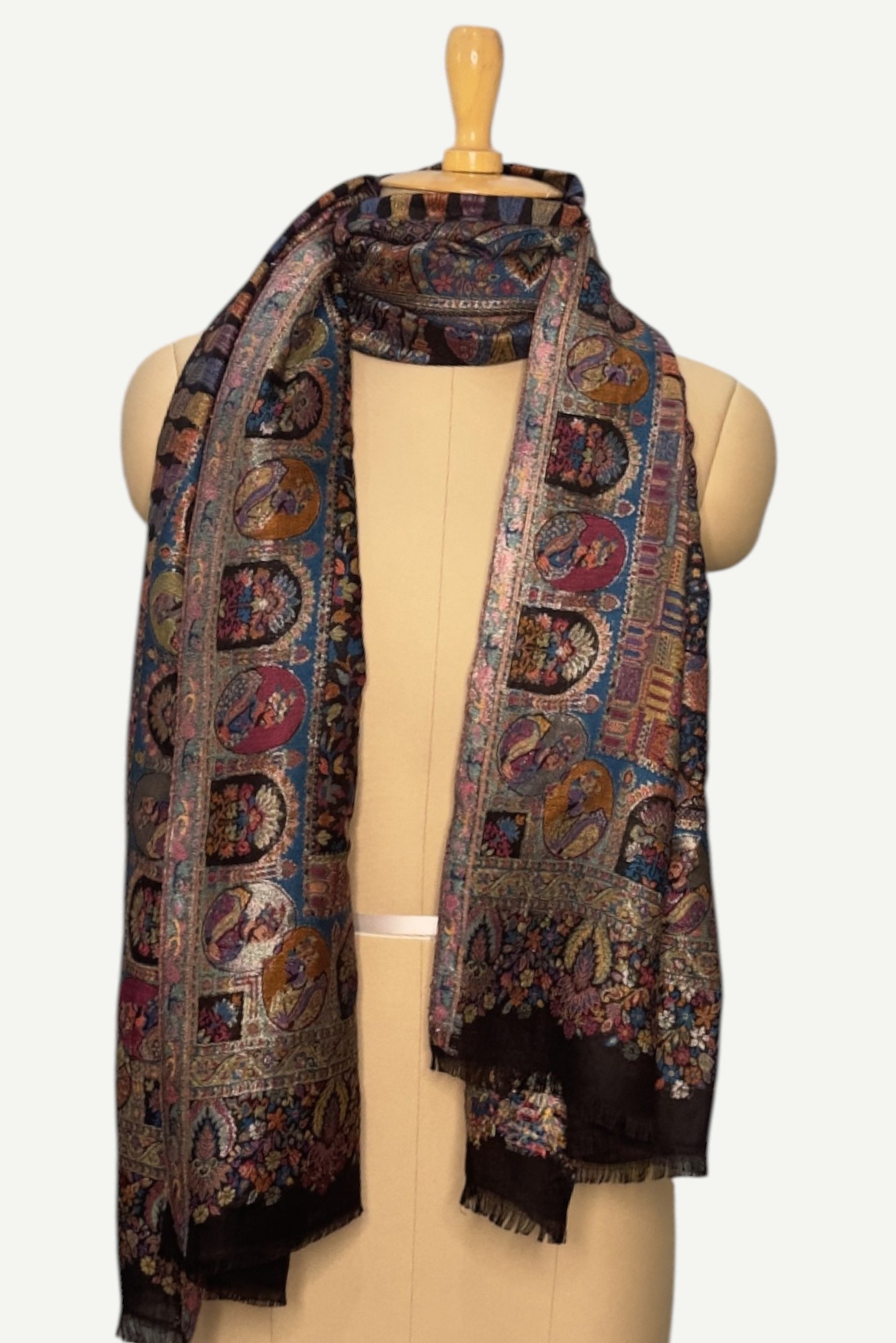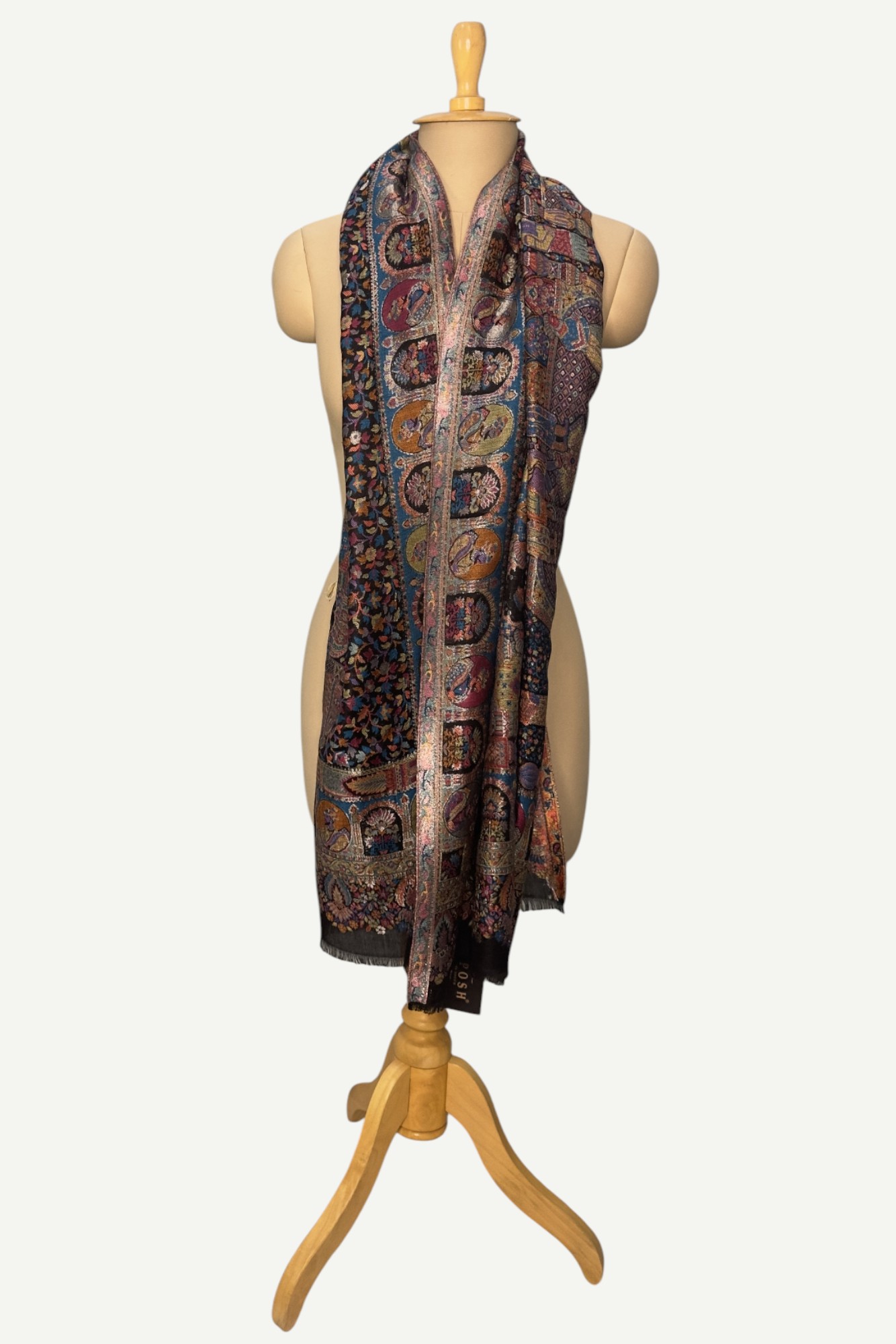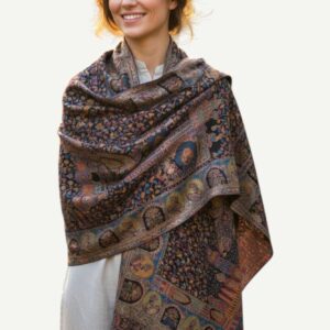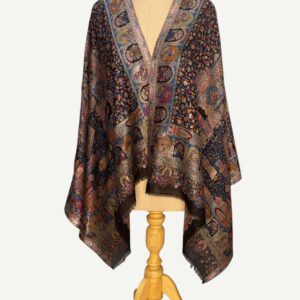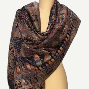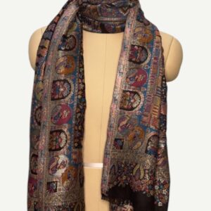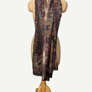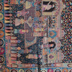 A magnificent Shahposh Rajwada style stole with Fine luxury silk pashmina woven with fine zari and resham threads. Stole is a testament to unparalleled luxury and artistic mastery. Its intricate design, a vibrant tapestry of rich blues, fiery oranges, delicate pinks, and verdant greens, speaks volumes of its exquisite craftsmanship. Each thread seems to whisper tales of heritage and dedication, creating a piece that is nothing short of a wearable work of art.