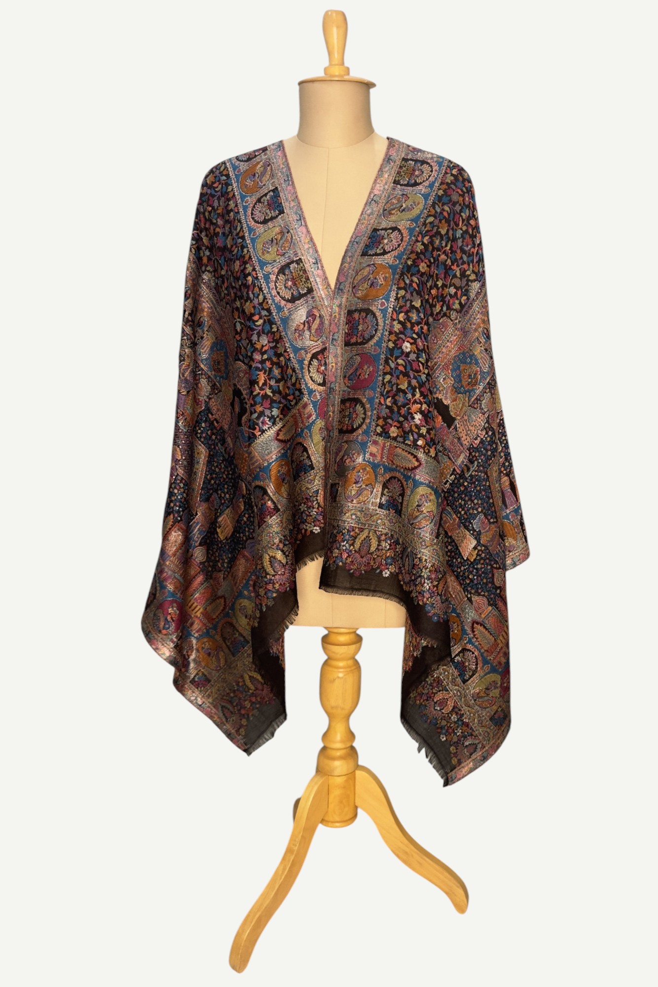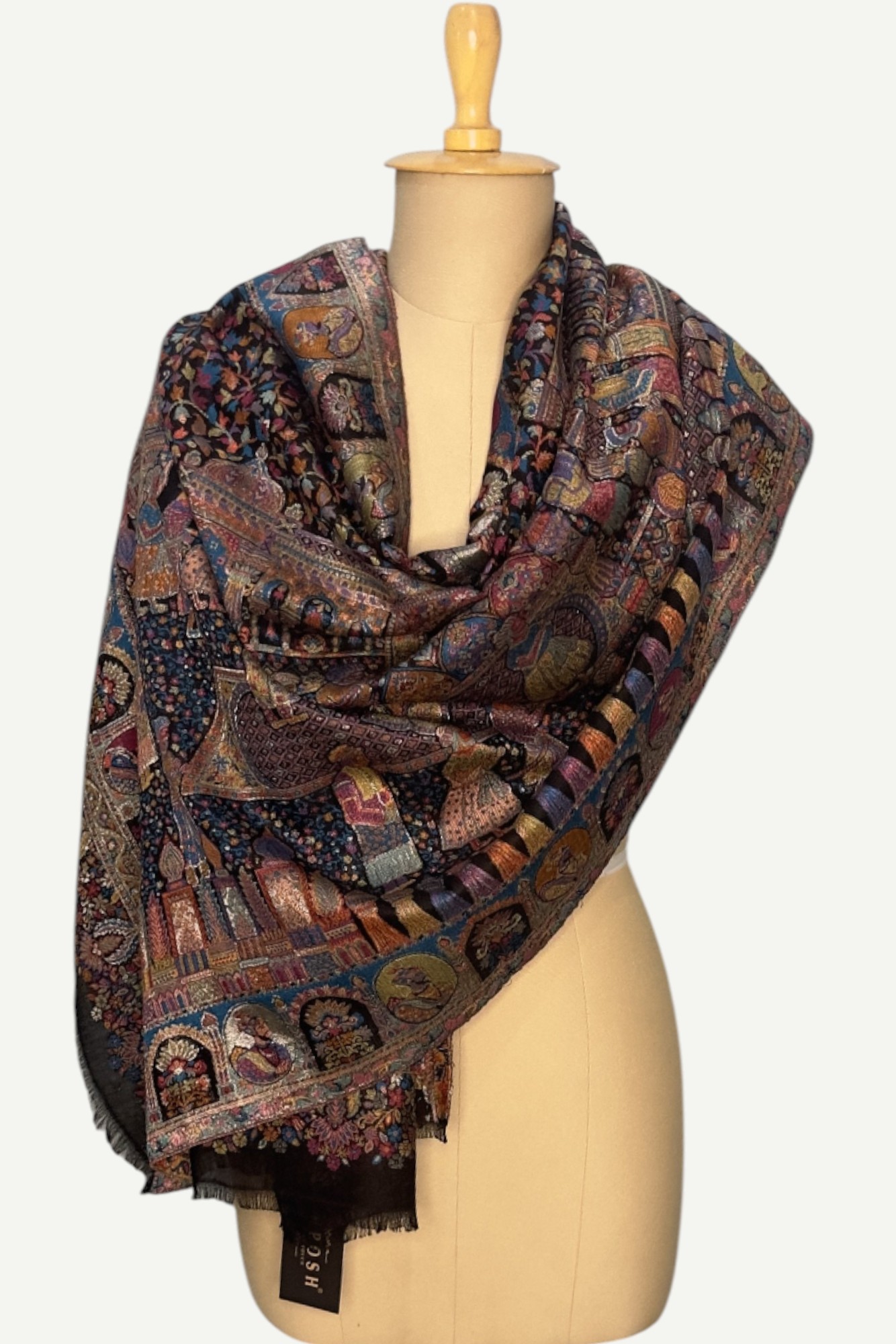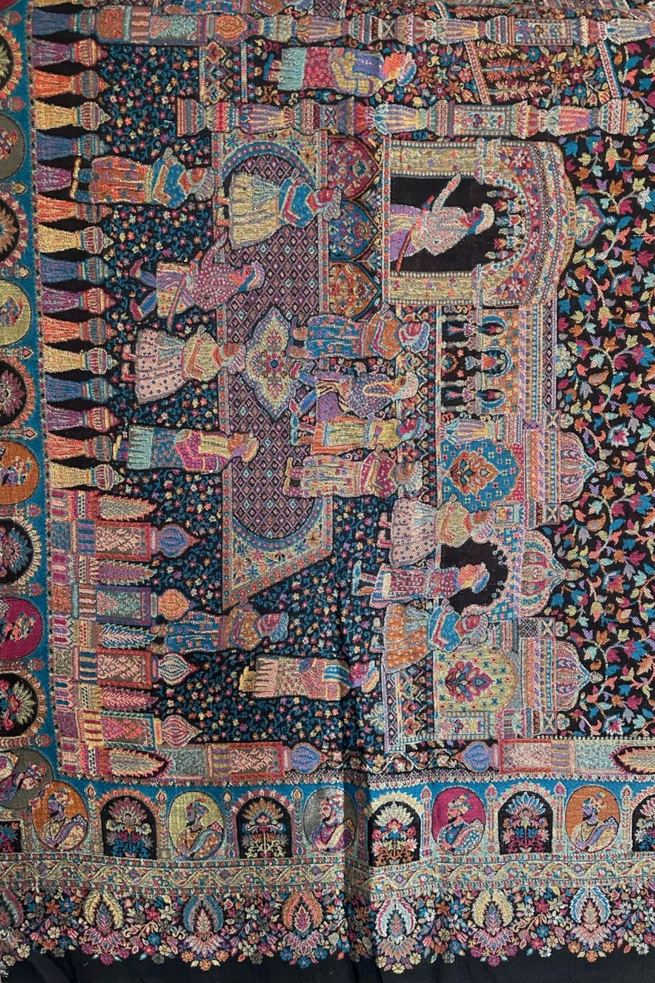 A magnificent Shahposh Rajwada style stole with Fine luxury silk pashmina woven with fine zari and resham threads. Stole is a testament to unparalleled luxury and artistic mastery. Its intricate design, a vibrant tapestry of rich blues, fiery oranges, delicate pinks, and verdant greens, speaks volumes of its exquisite craftsmanship. Each thread seems to whisper tales of heritage and dedication, creating a piece that is nothing short of a wearable work of art.