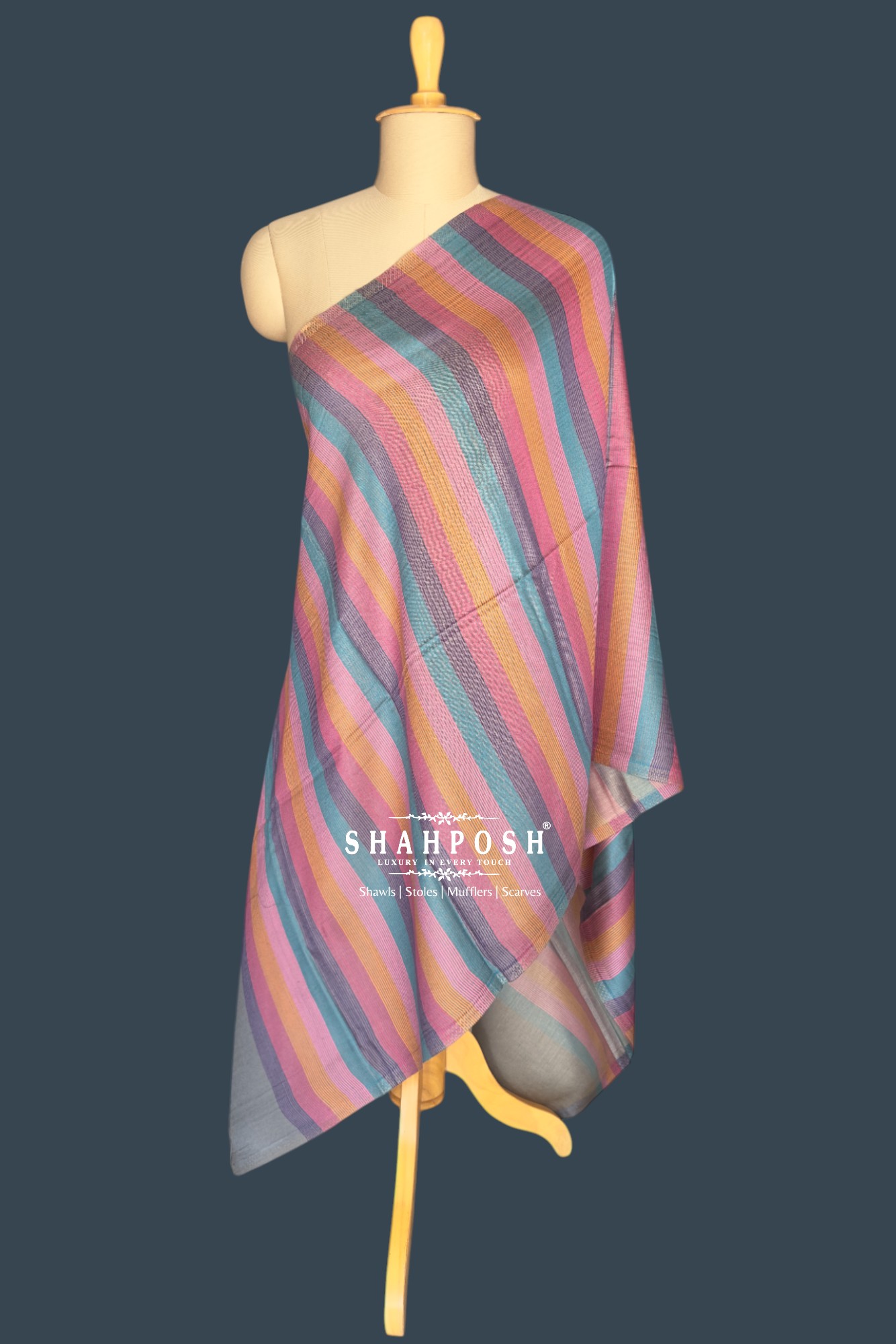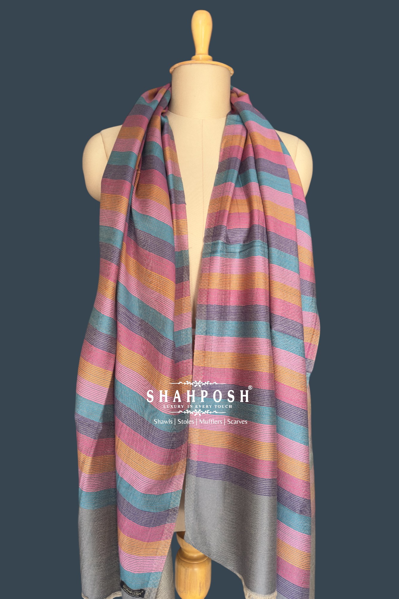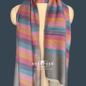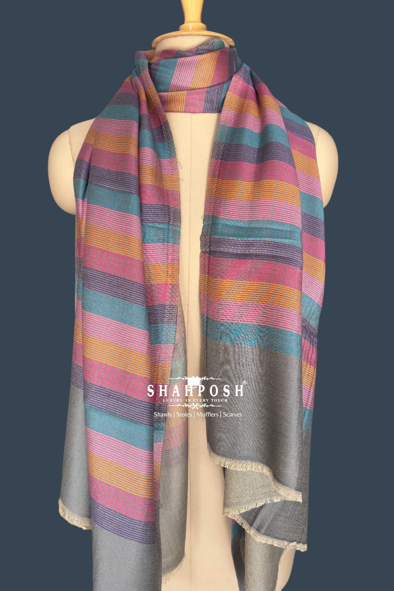 A Shahposh Fine Wool Multicoloured Striped patterned stole sophisticated striped pattern in a striking multicolor , creating an elegant and artistic feel. The intricate details of the design make it a true statement piece.