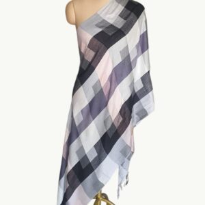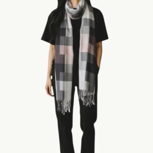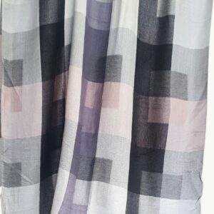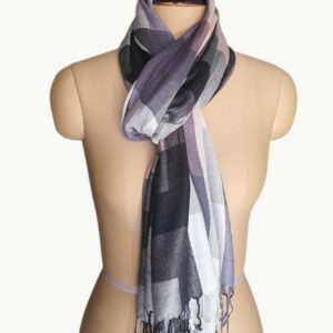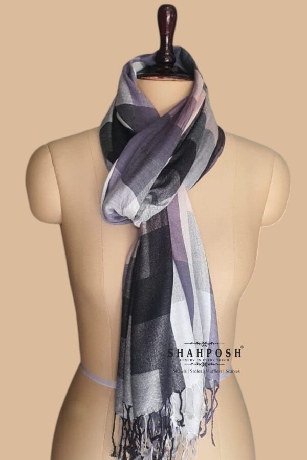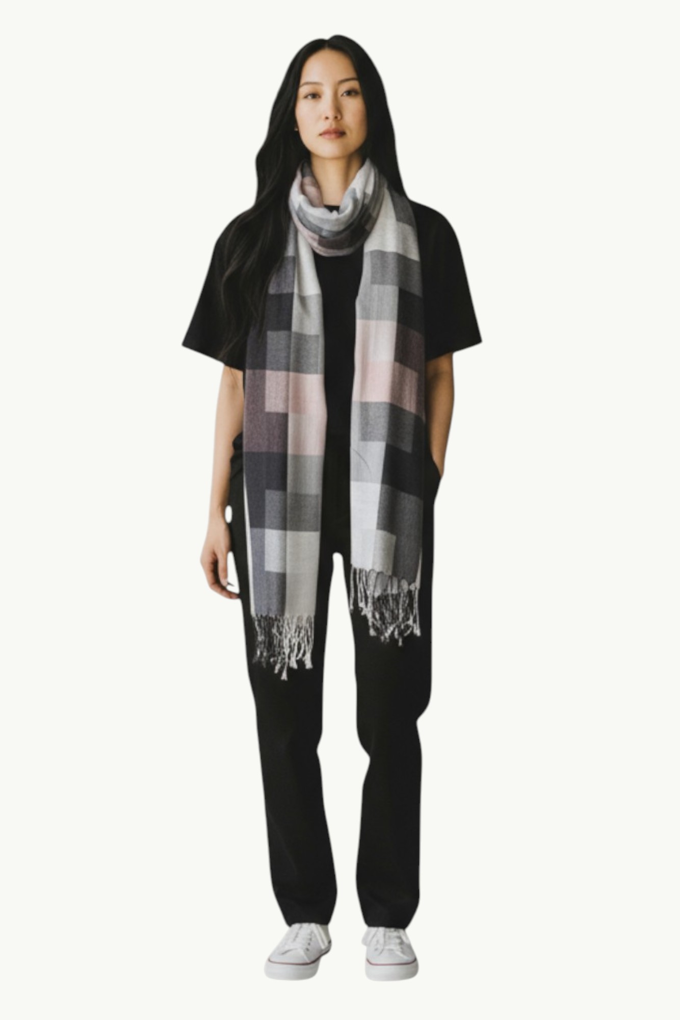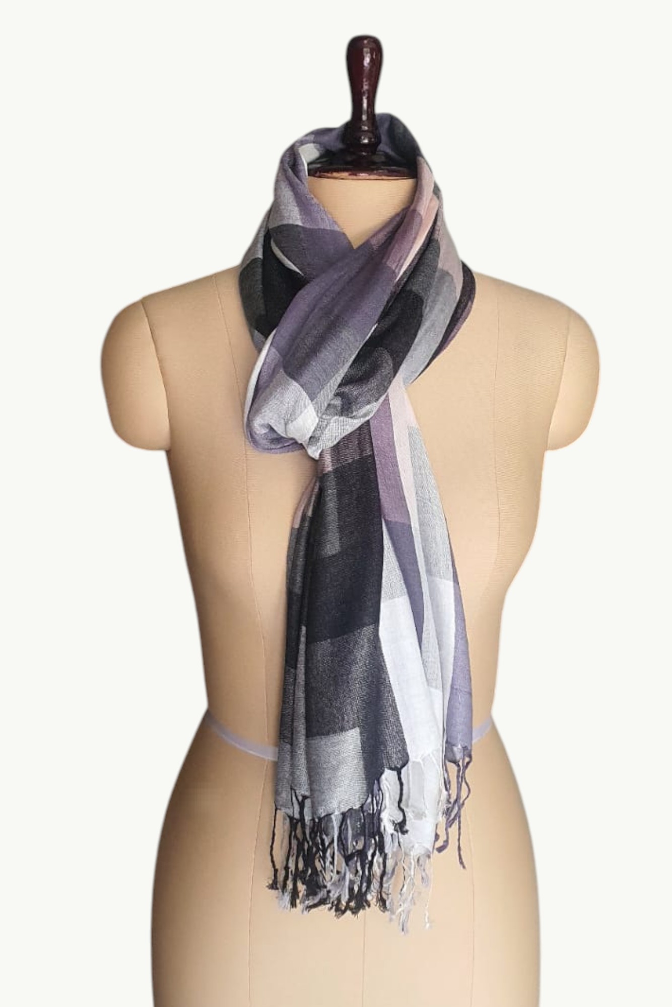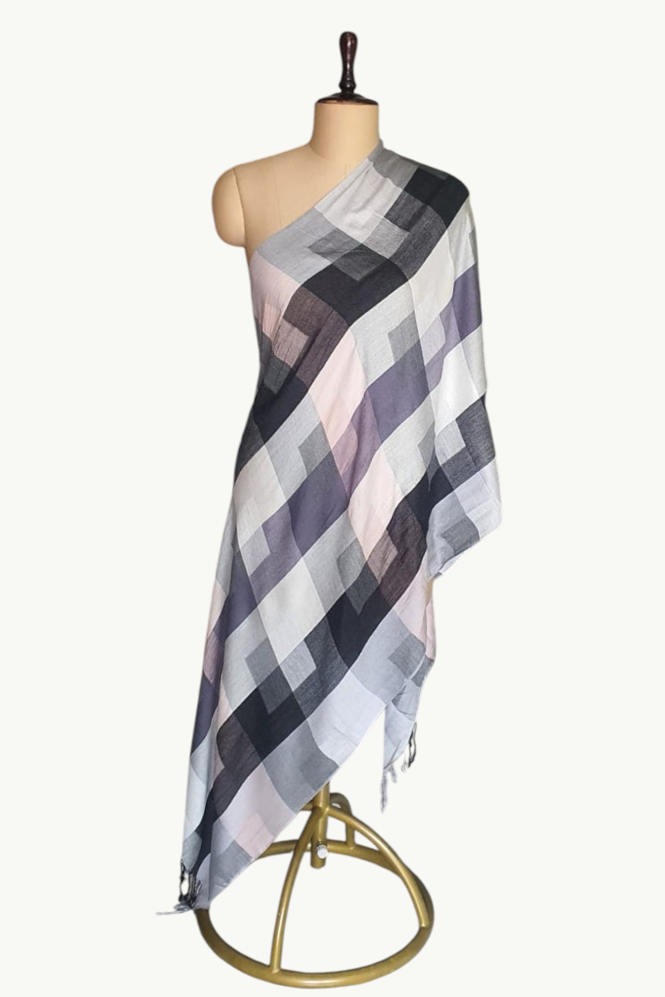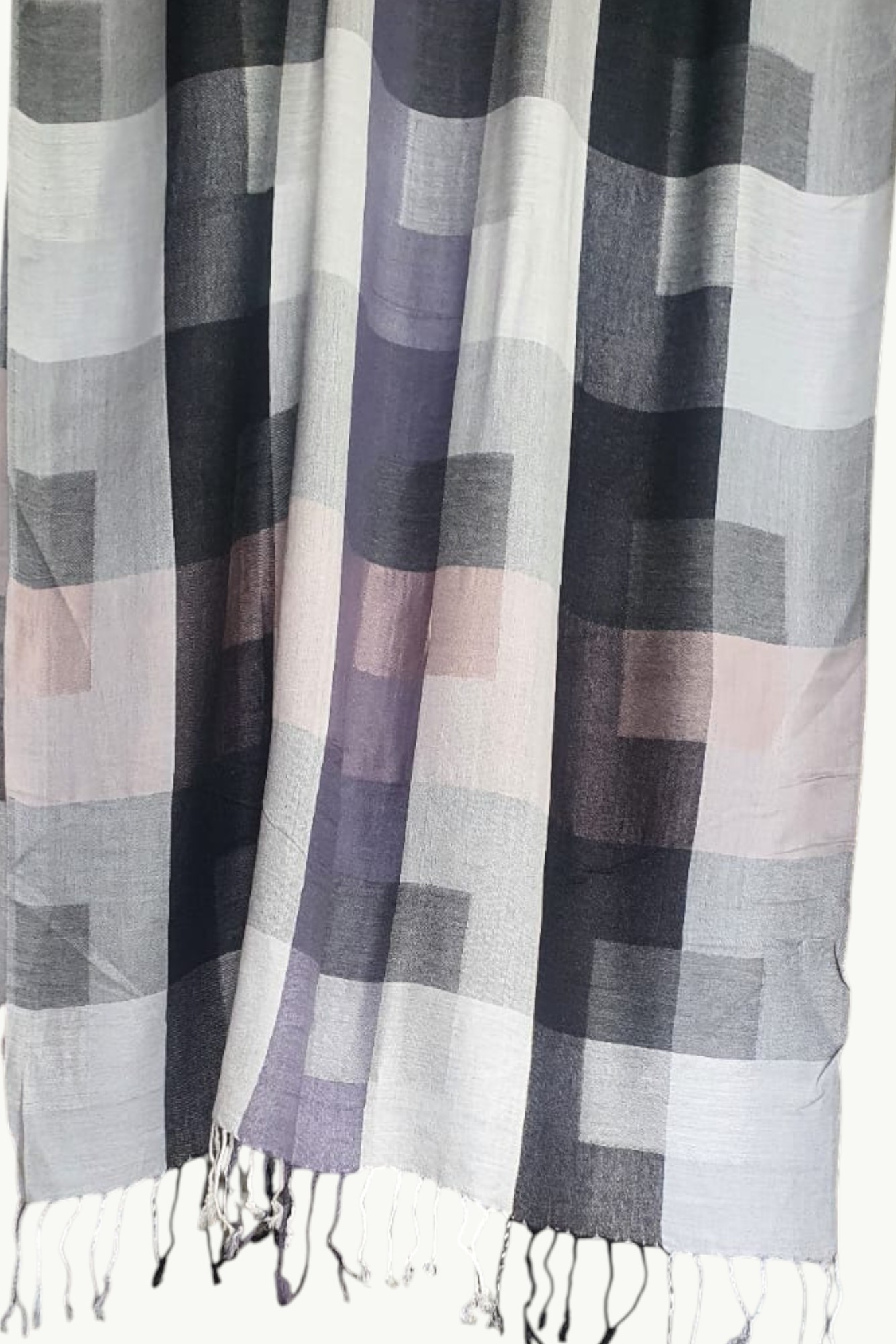 A stylish Shahposh checkered Viscose Bamboo Fibre Stole in shades of black, white, and gray with subtle hints of pink. Made from lightweight fabric, it features a soft drape and fringed edges, offering a sophisticated and versatile look. Perfect for layering in any season.