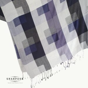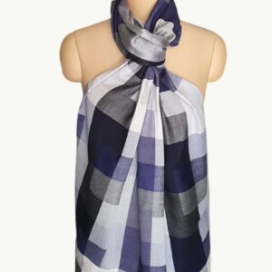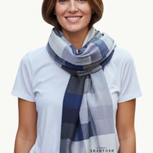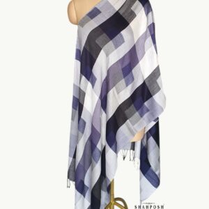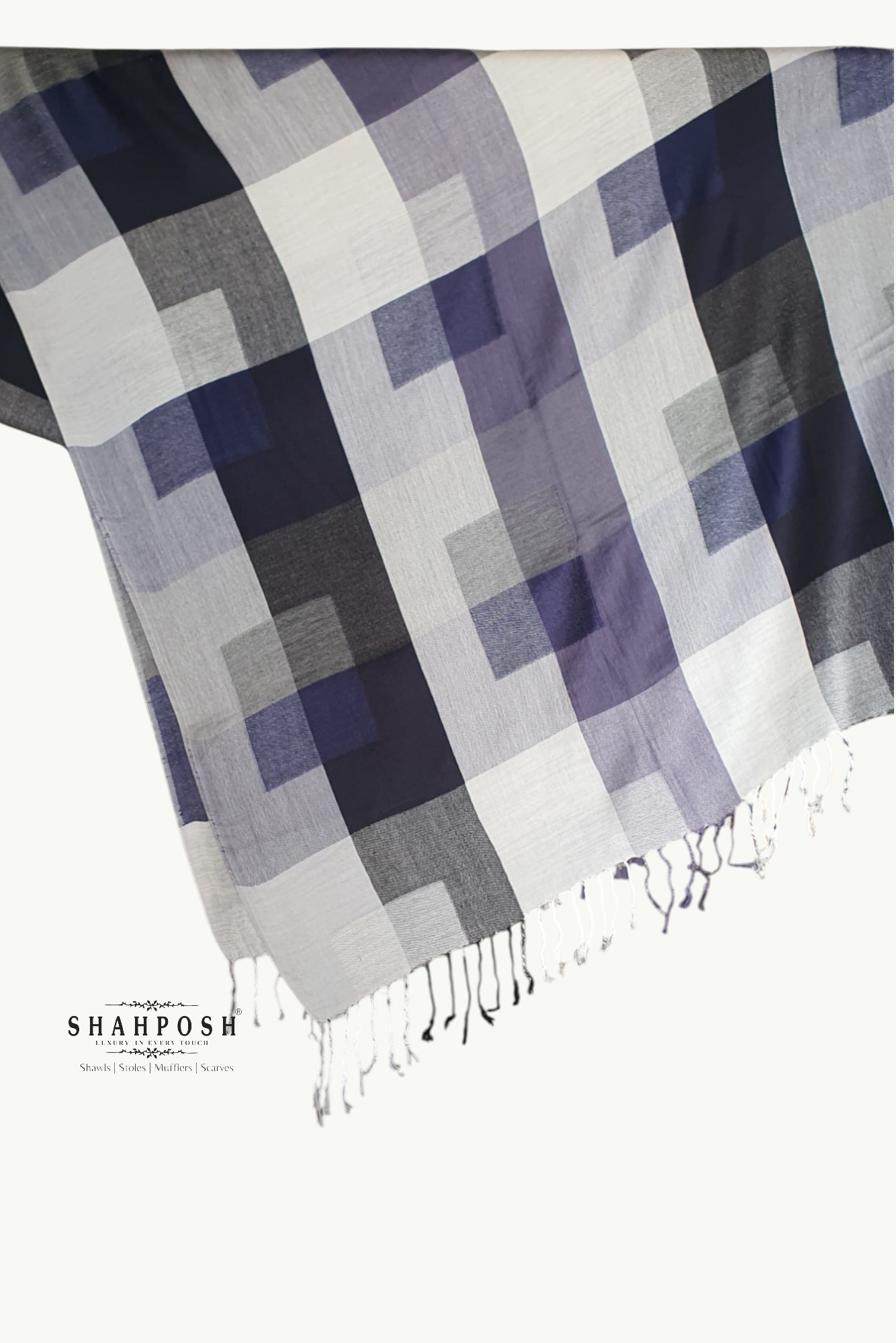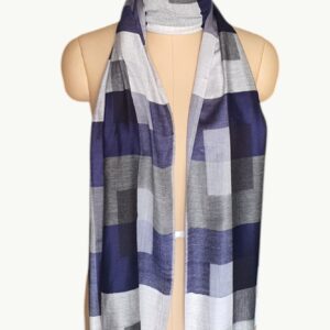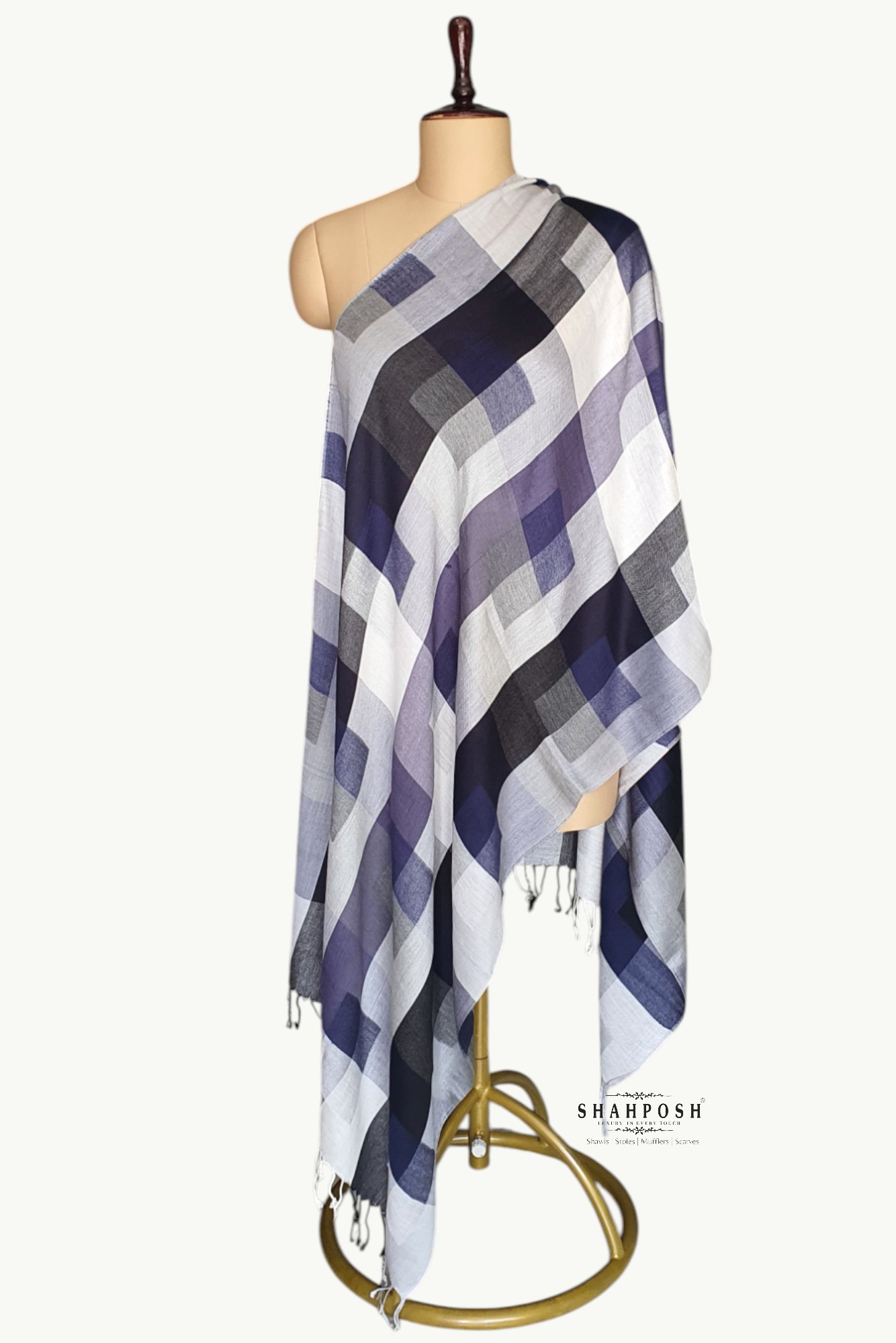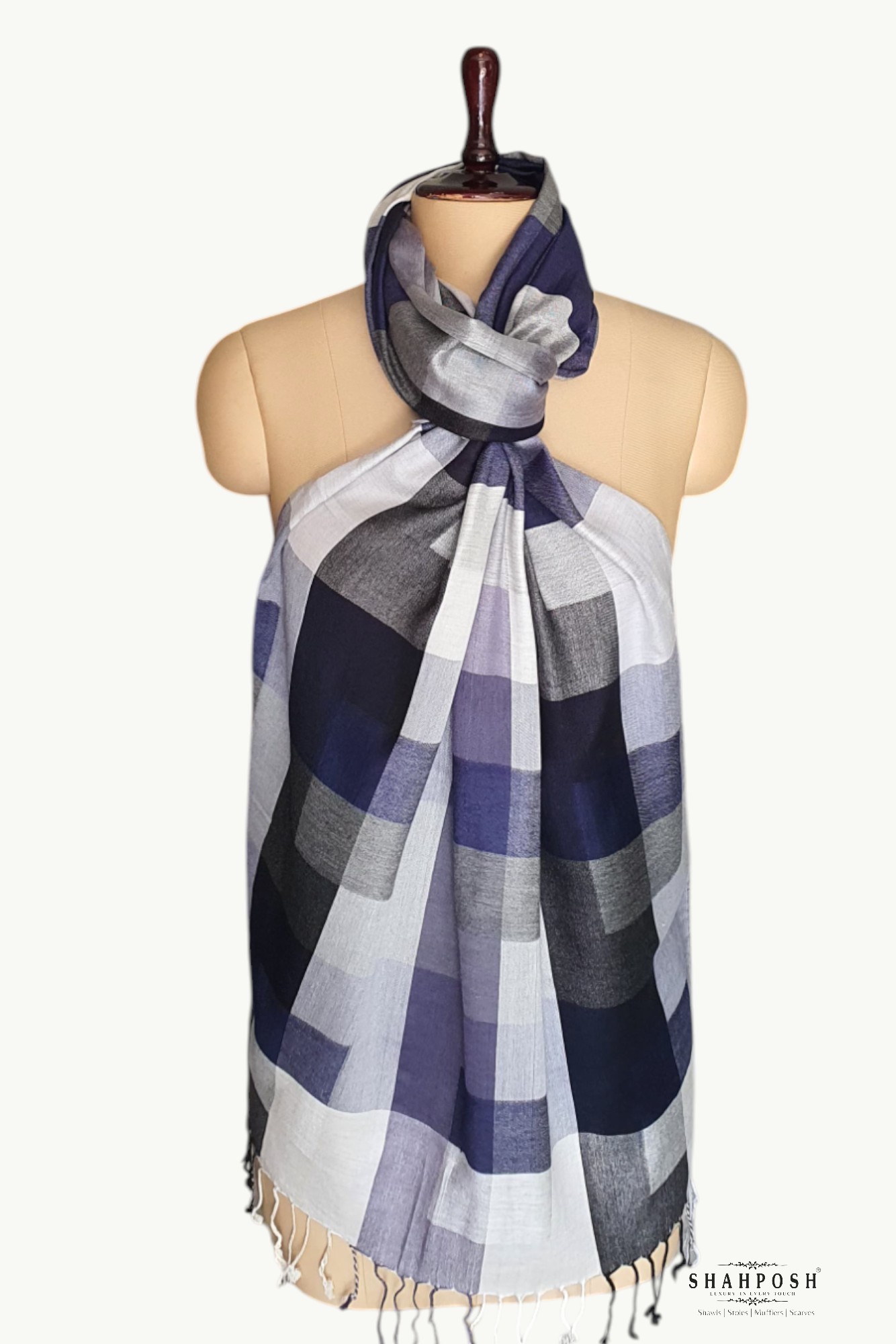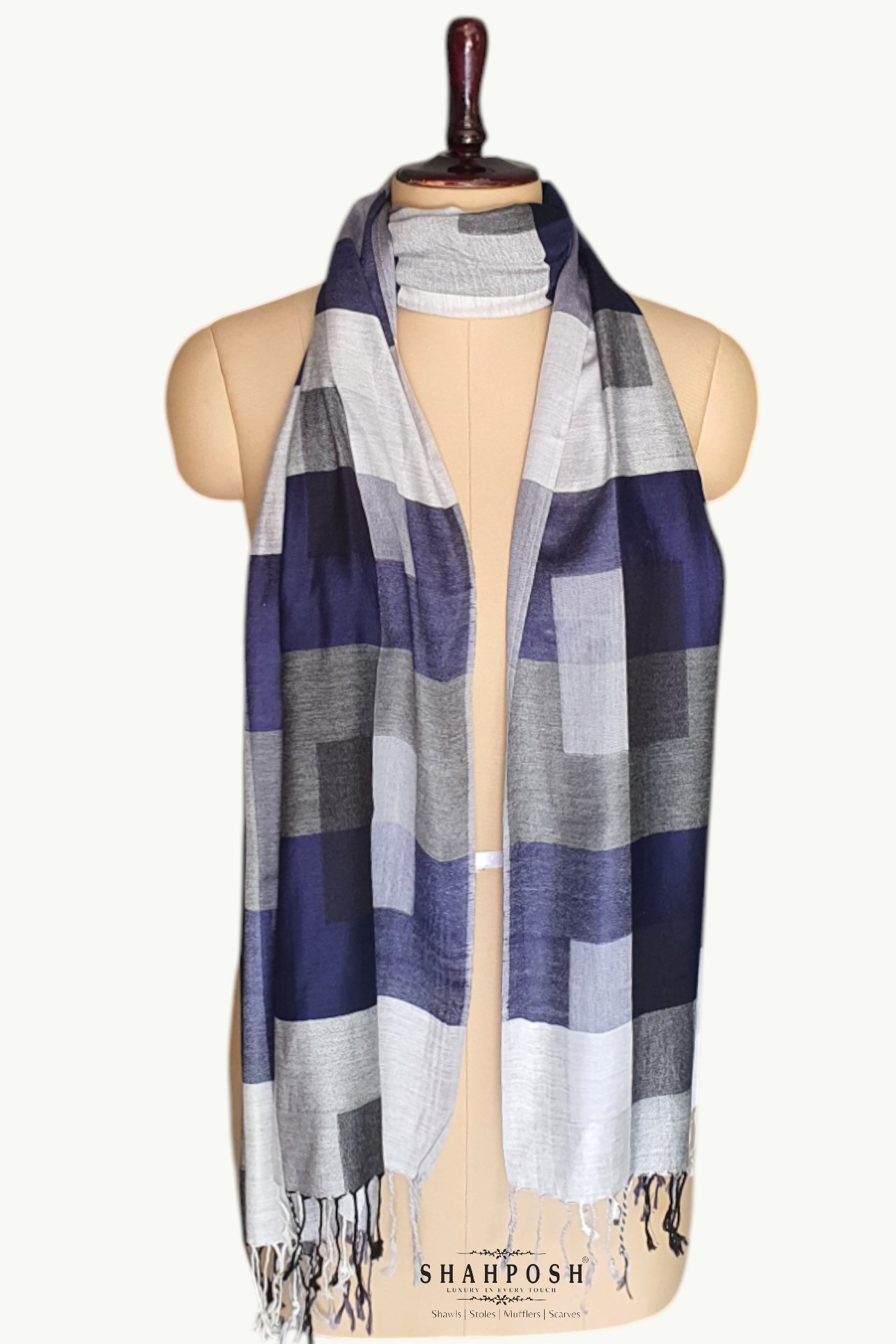 A Shahposh stylish checkered Viscose Bamboo Fibre stole in shades of blue, black, and white, draped over a mannequin. Made from lightweight fabric with fringed edges, it offers an elegant and cozy look.