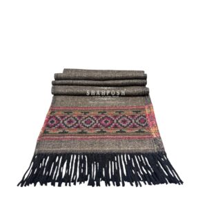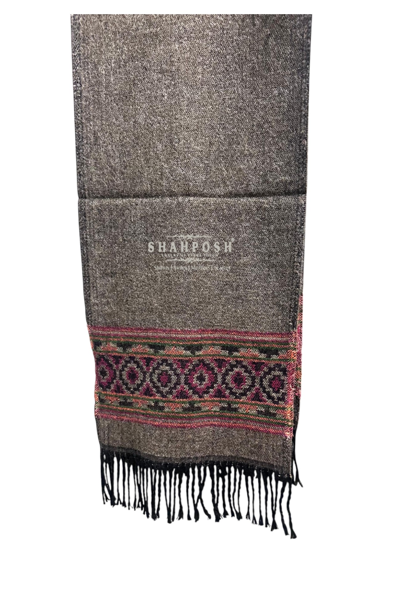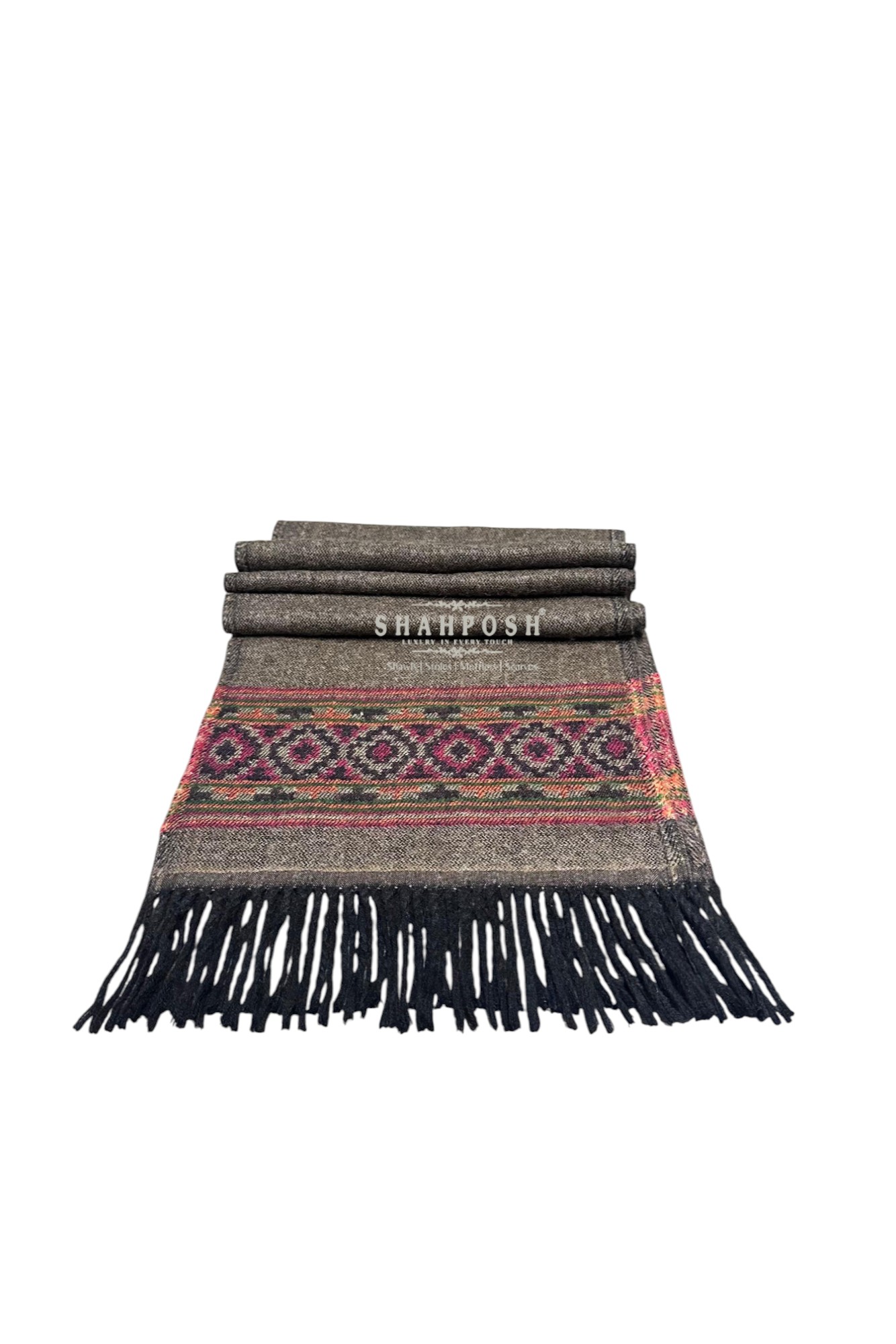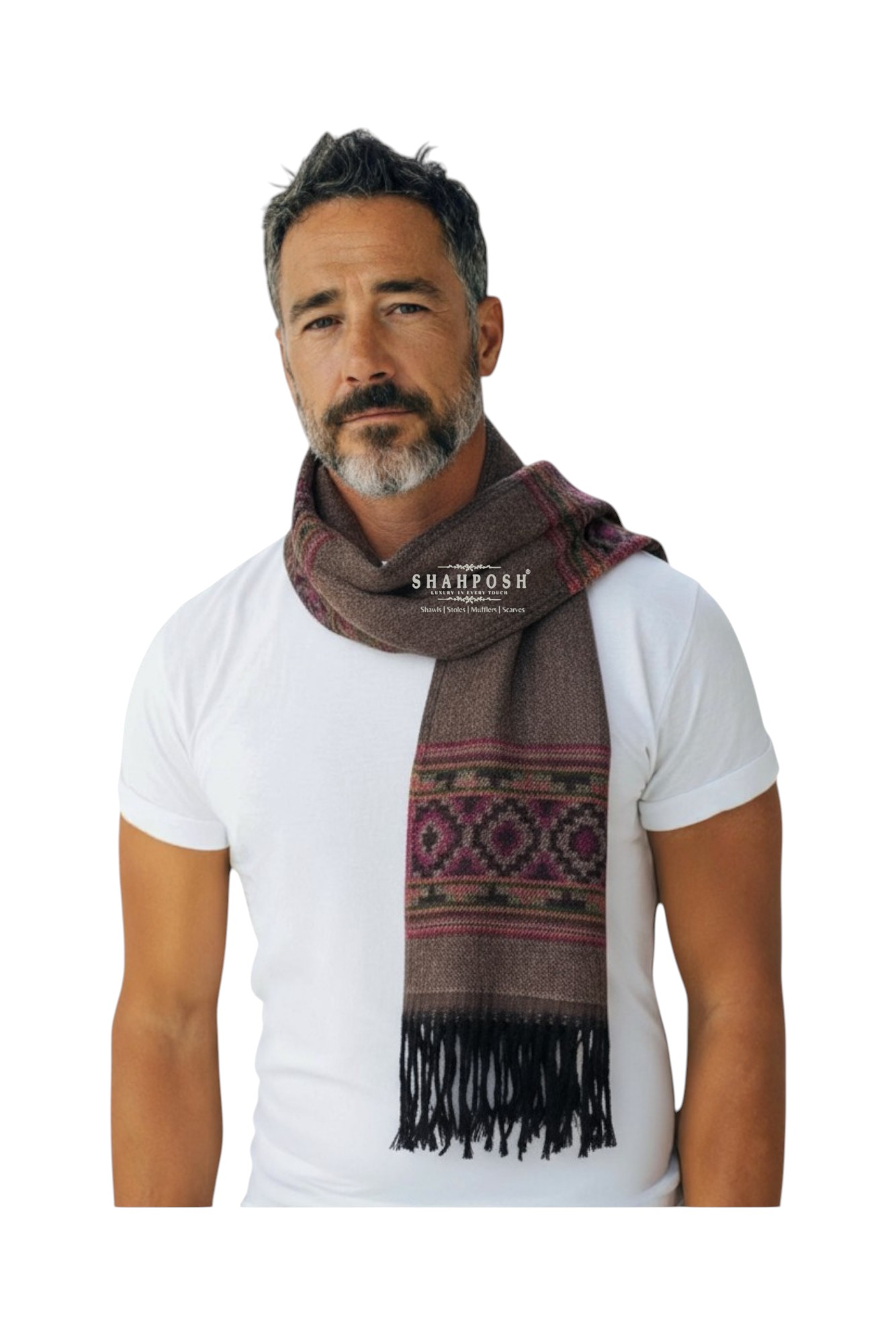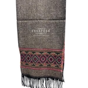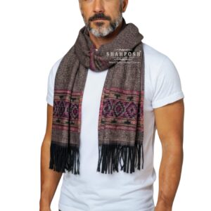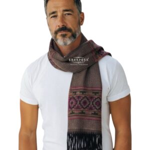 The Shahposh Cashmere Wool Blend brown muffler is a stylish, woolen scarf with a sophisticated and traditional design. It is primarily brown with intricate patterns in red, black, and green woven near the ends, adding a touch of elegance.It is draped over a light-colored suit, showcasing how it can complement formal attire. The texture appears soft and warm, making it ideal for colder weather.