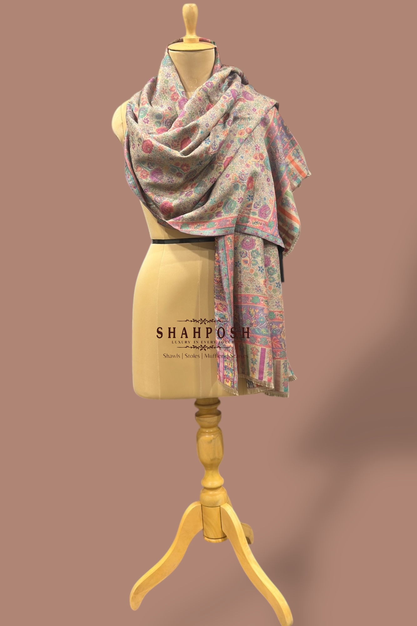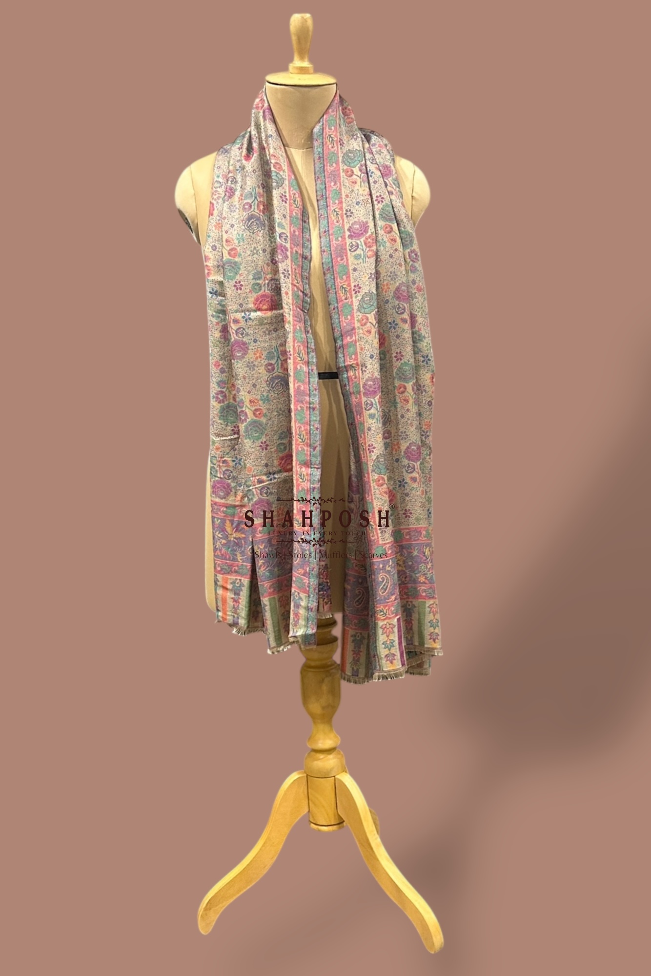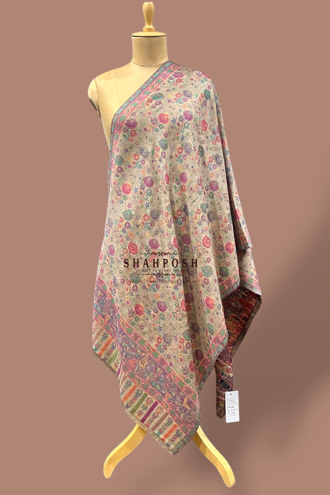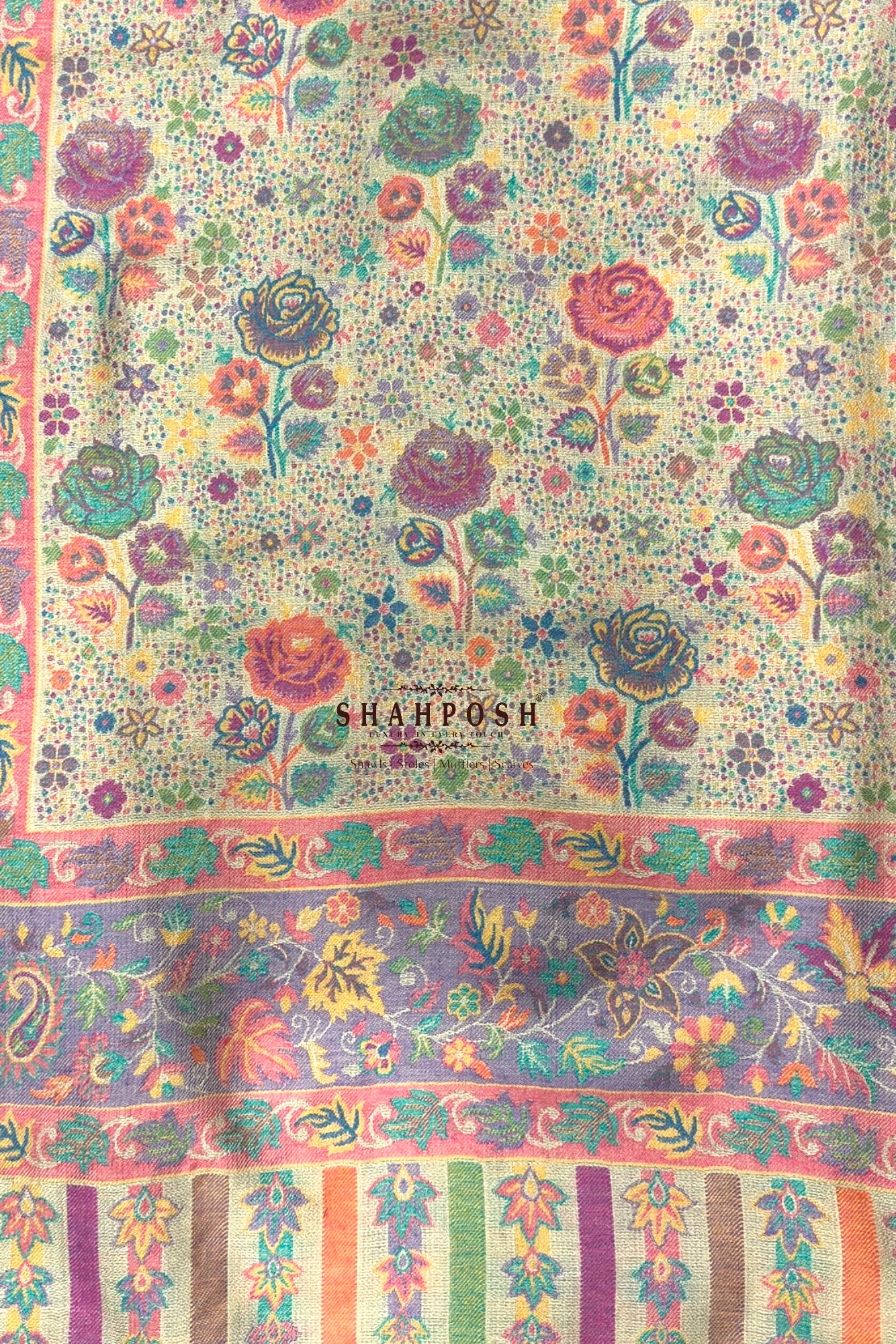 A beautifully designed Shahposh wool blend stole with a soft beige base, adorned with a floral pattern in vibrant shades of pink, purple, and green. The delicate border adds an elegant touch, making it perfect for both casual and formal wear.