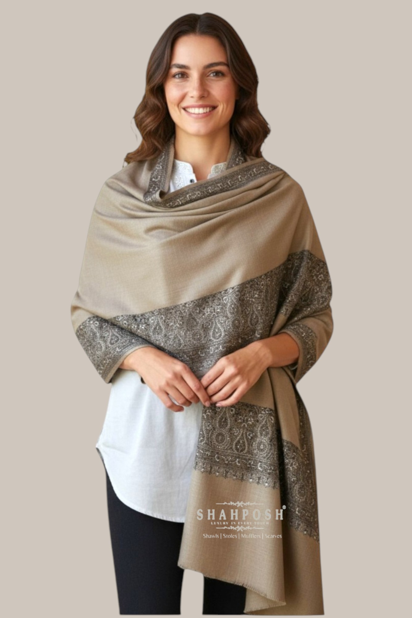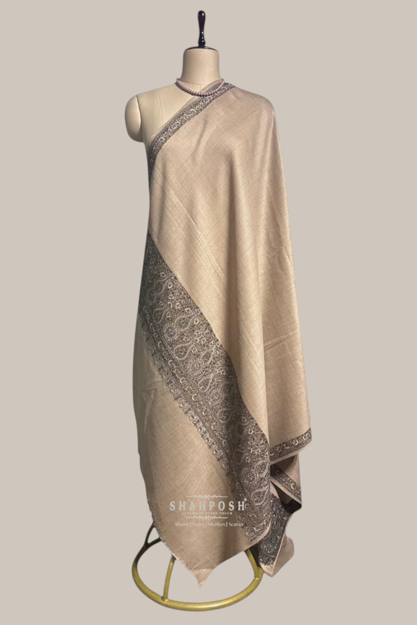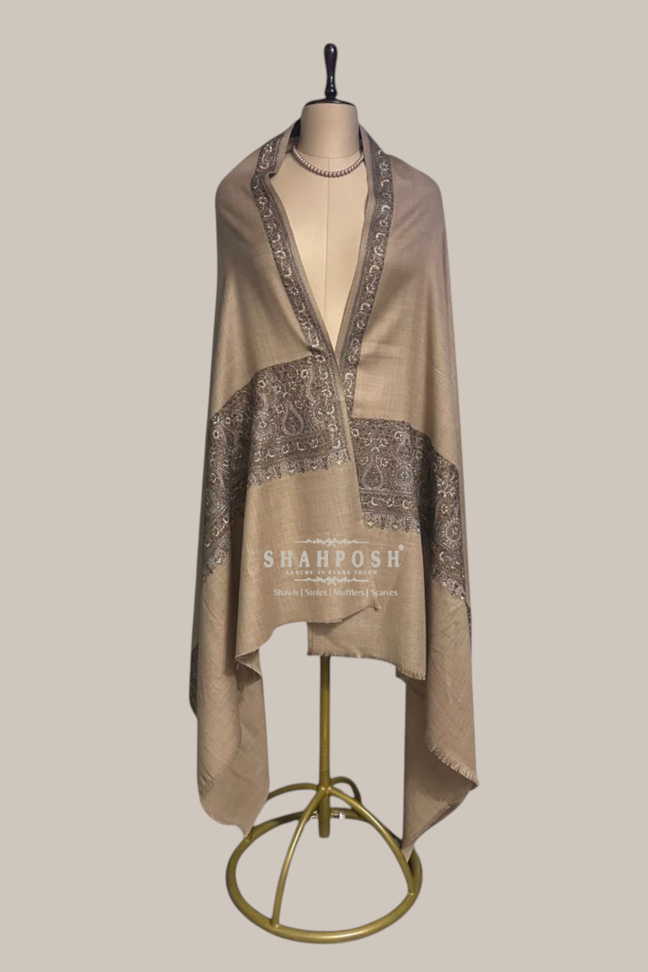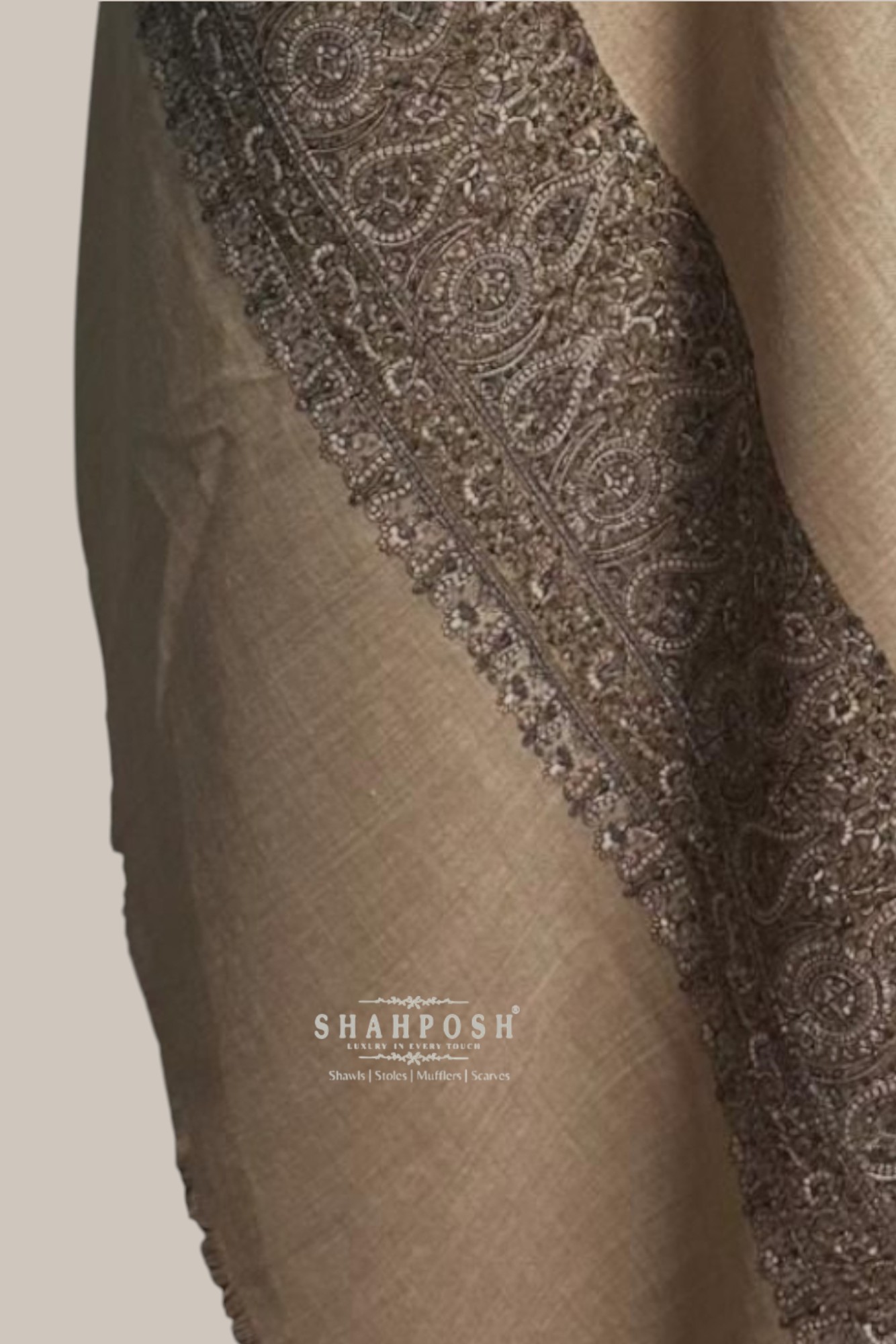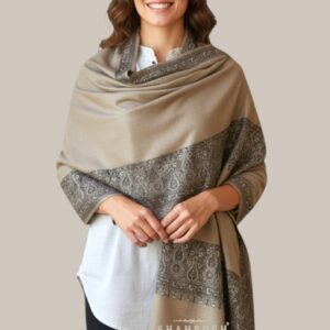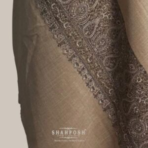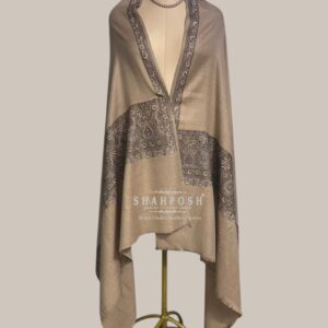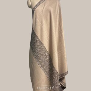 A timeless beige Shahposh Woolen shawl featuring exquisite paisley embroidery along the border, showcasing the rich legacy of traditional craftsmanship. Its delicate detailing and luxurious fabric embody heritage and elegance, making it a perfect blend of classic and contemporary style.