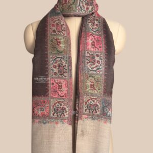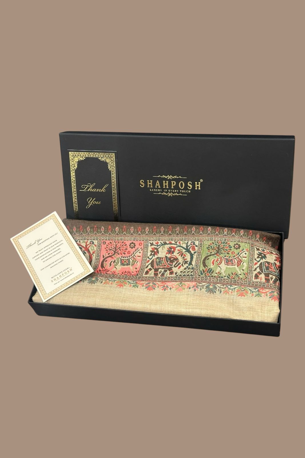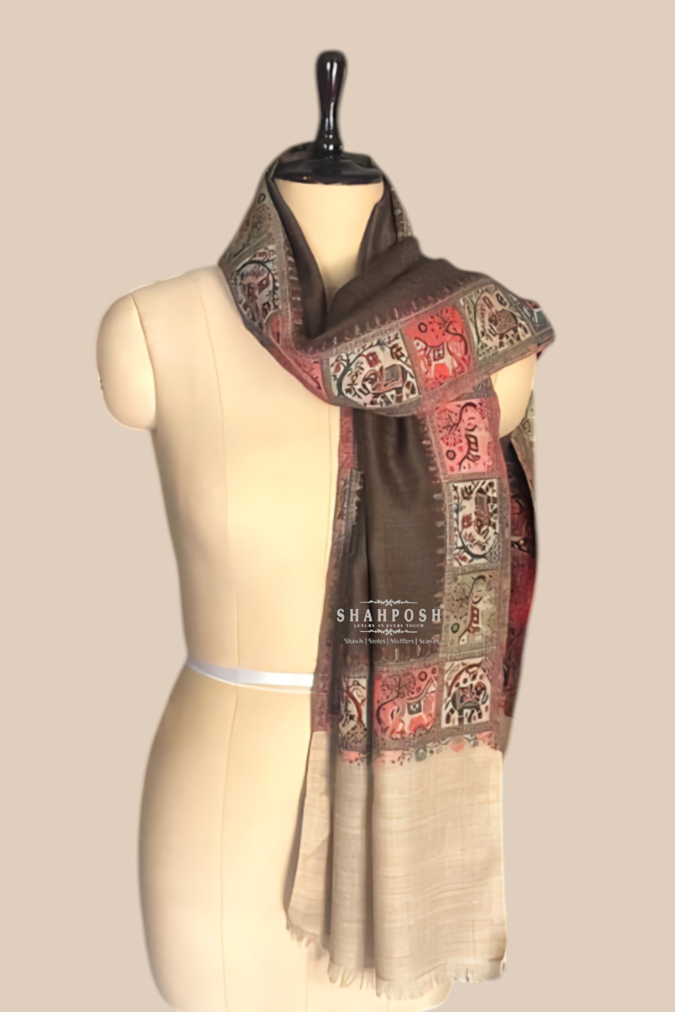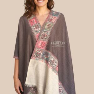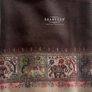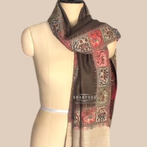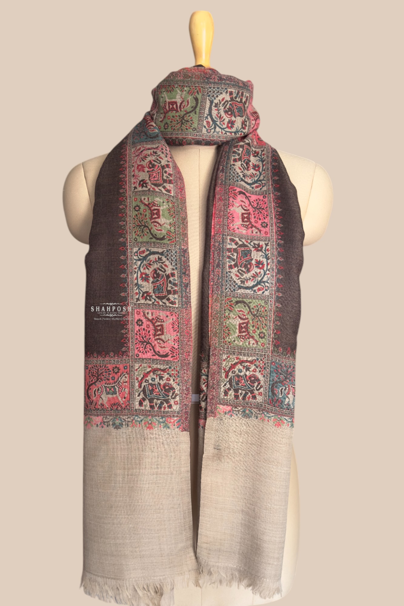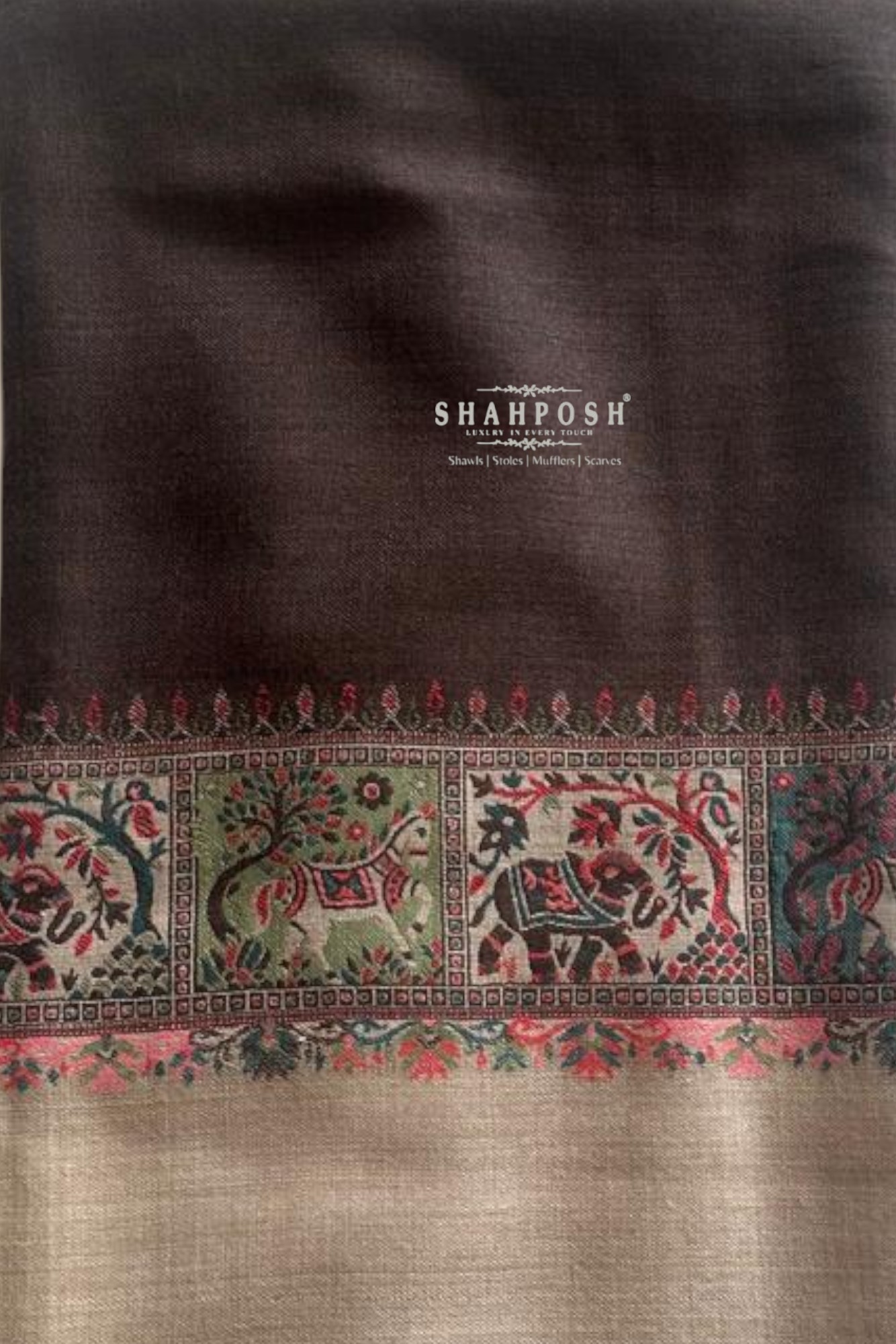 A luxurious brown and beige Shahposh shawl intricate animal and floral designs. . The elegant contrast and fine craftsmanship make it a timeless statement piece for any occasion.