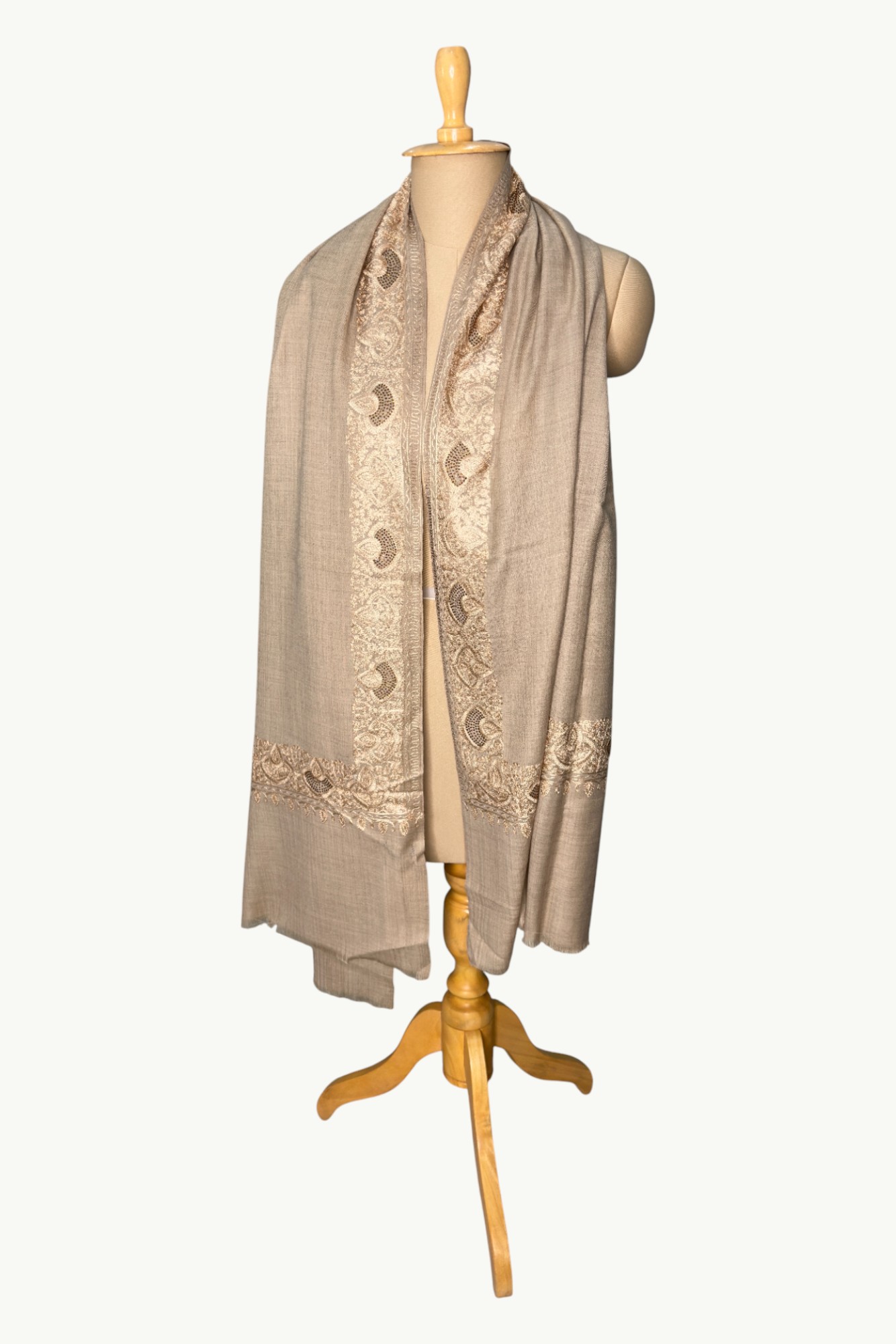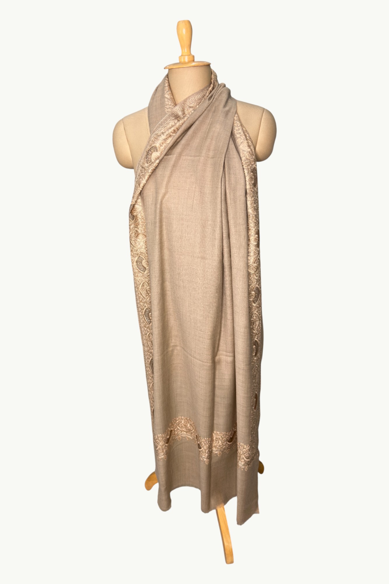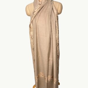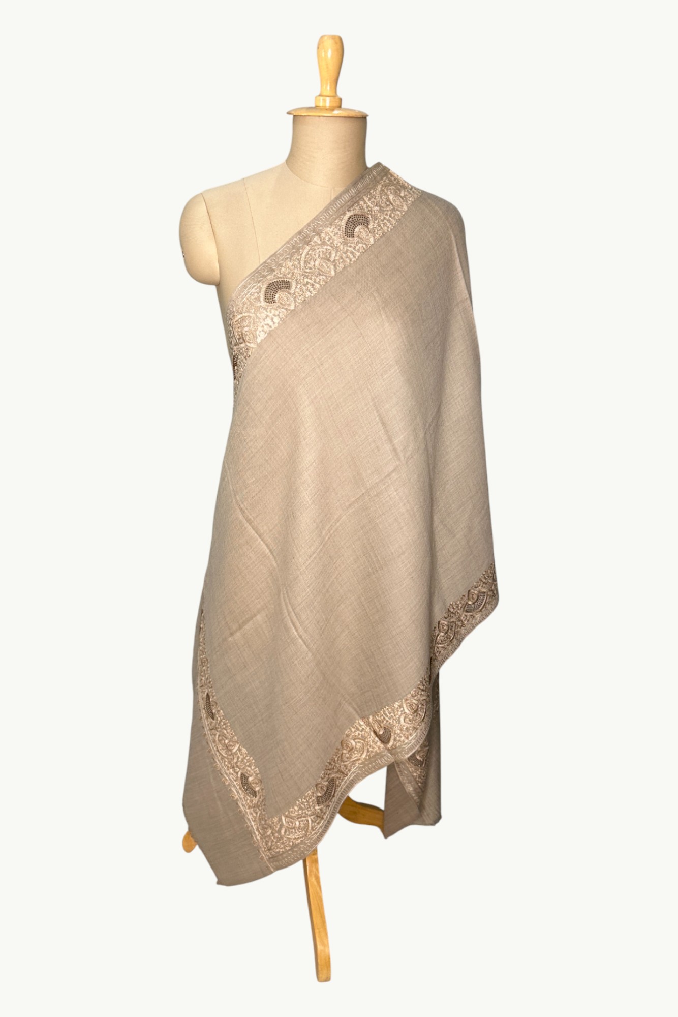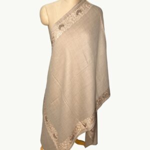Luxurious beige Shahposh stole featuring intricate embroidery along the borders, exuding timeless elegance and sophistication.