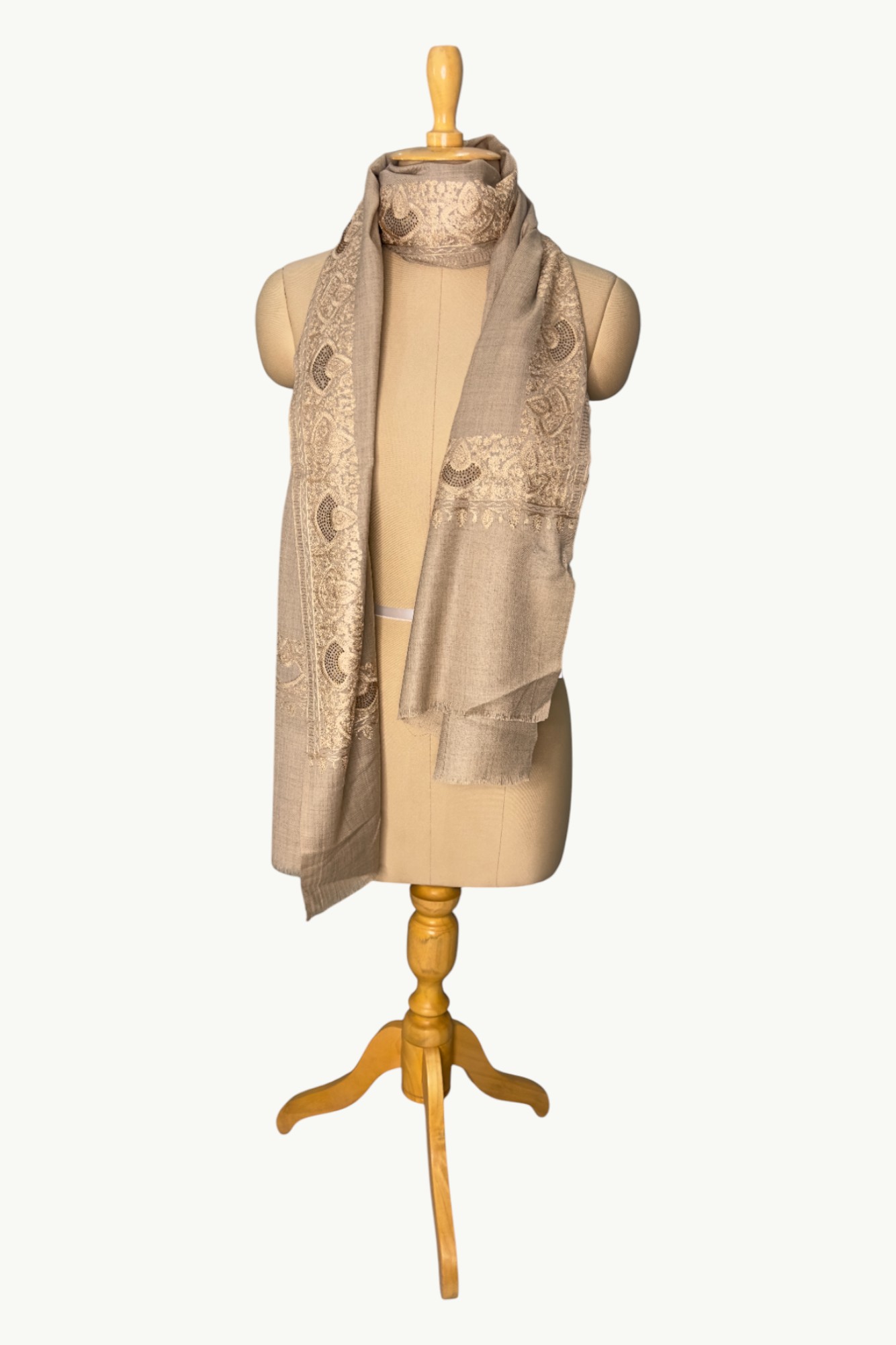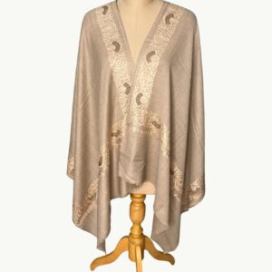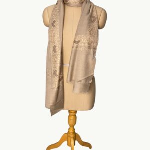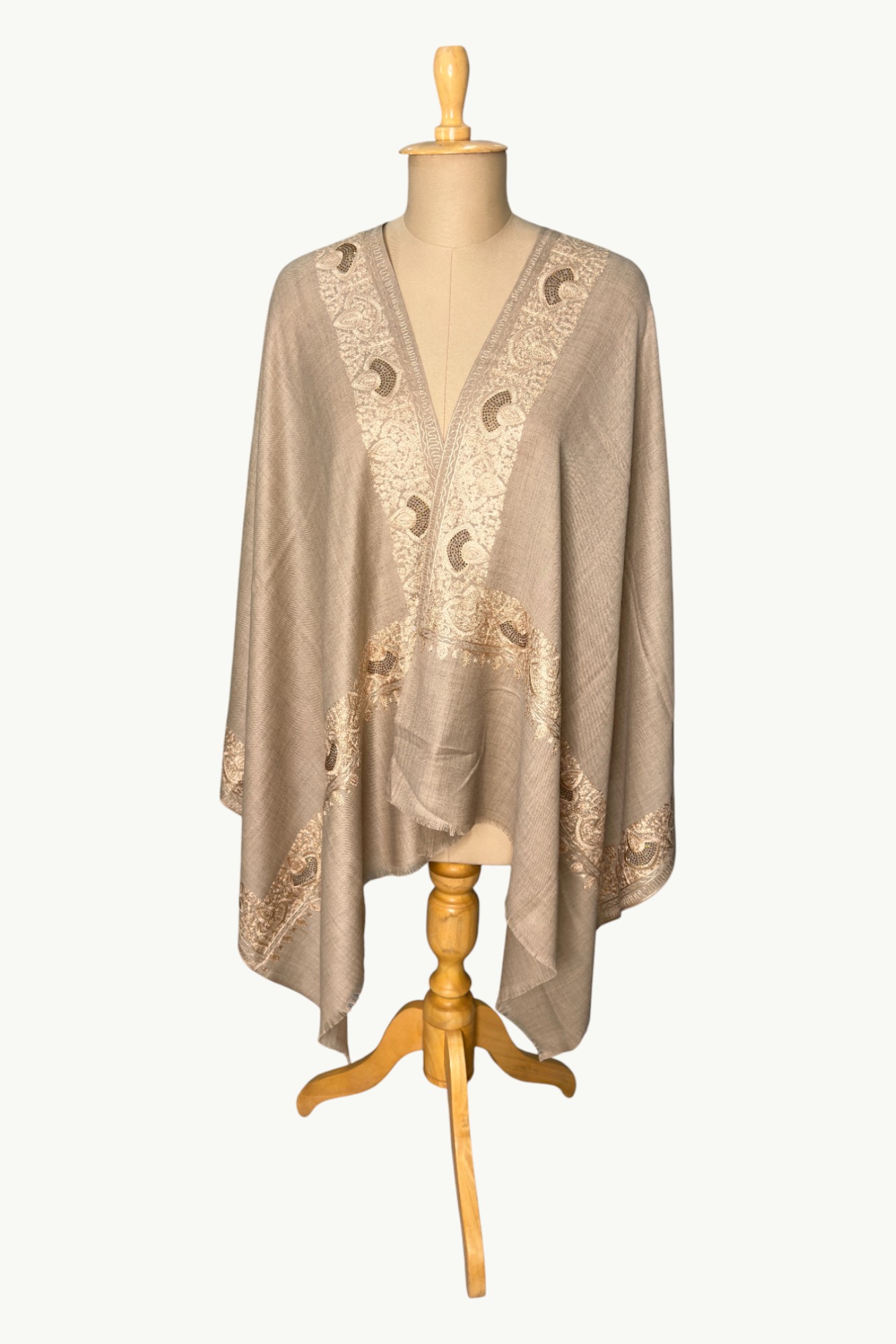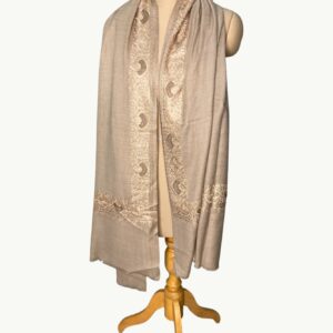 Luxurious beige Shahposh stole featuring intricate embroidery along the borders, exuding timeless elegance and sophistication.