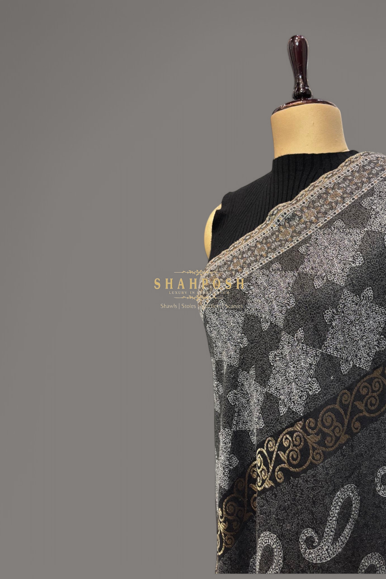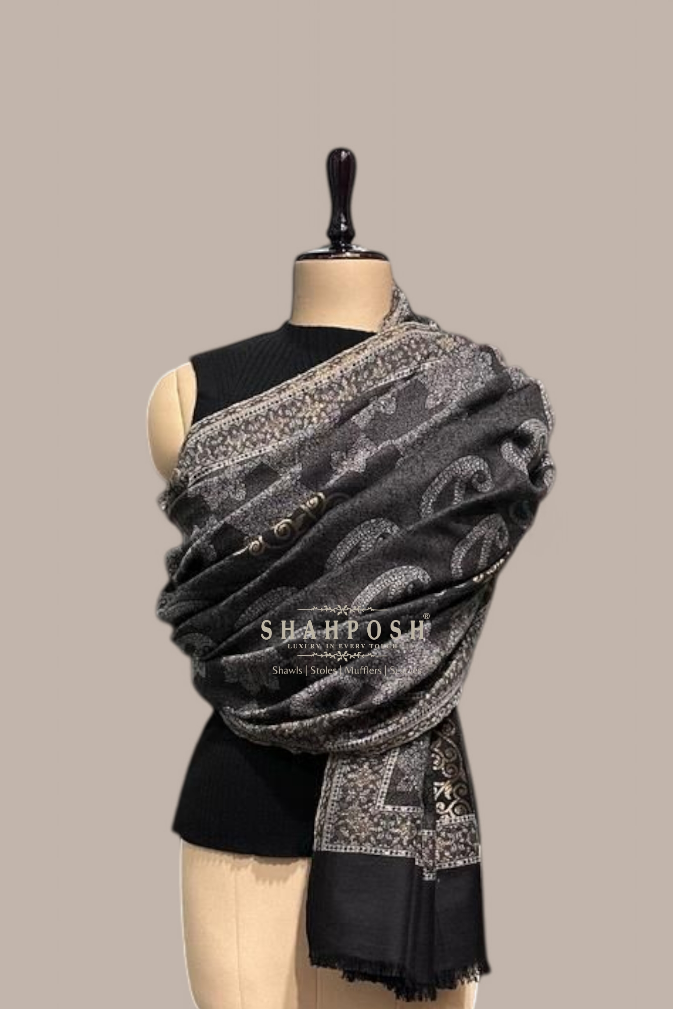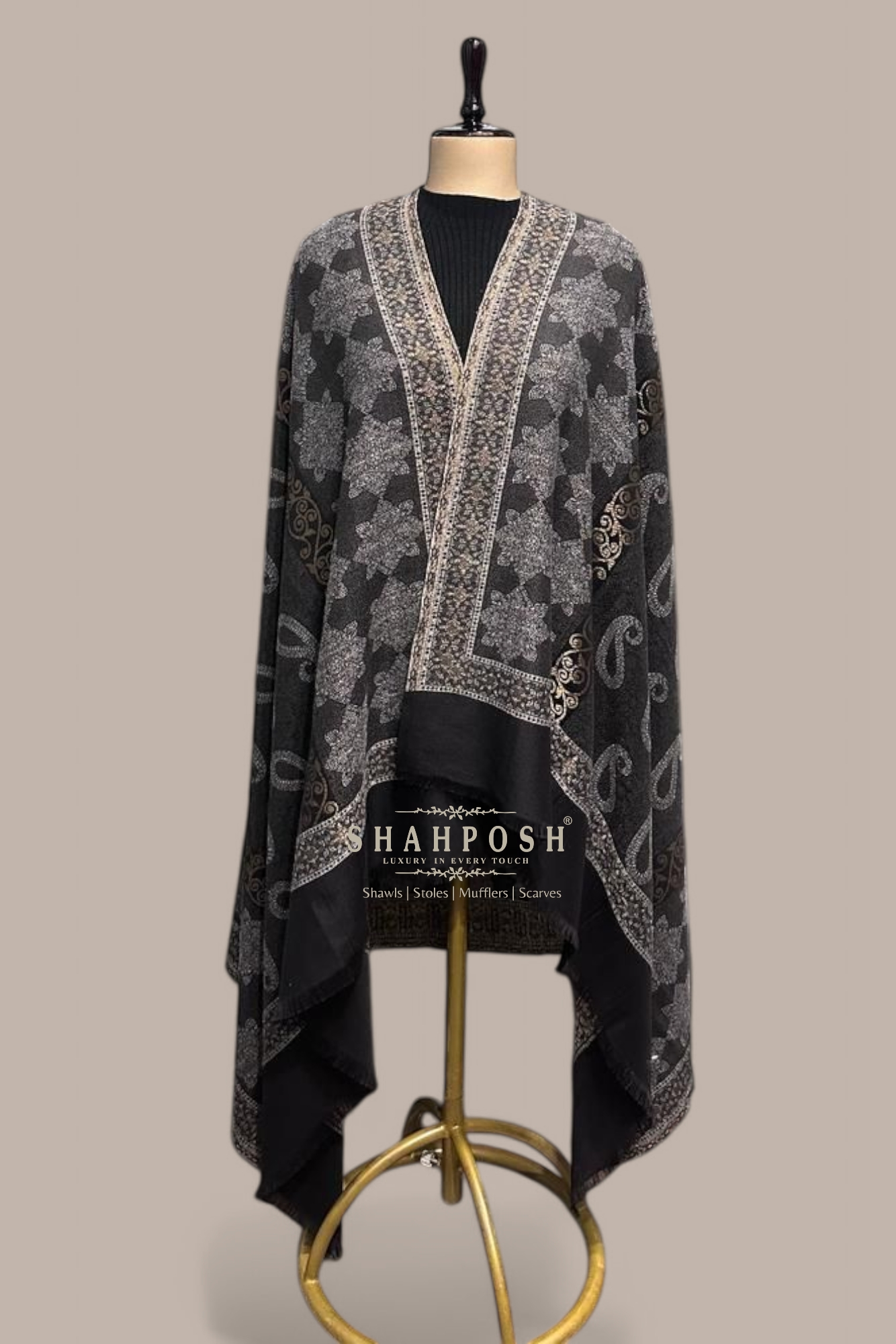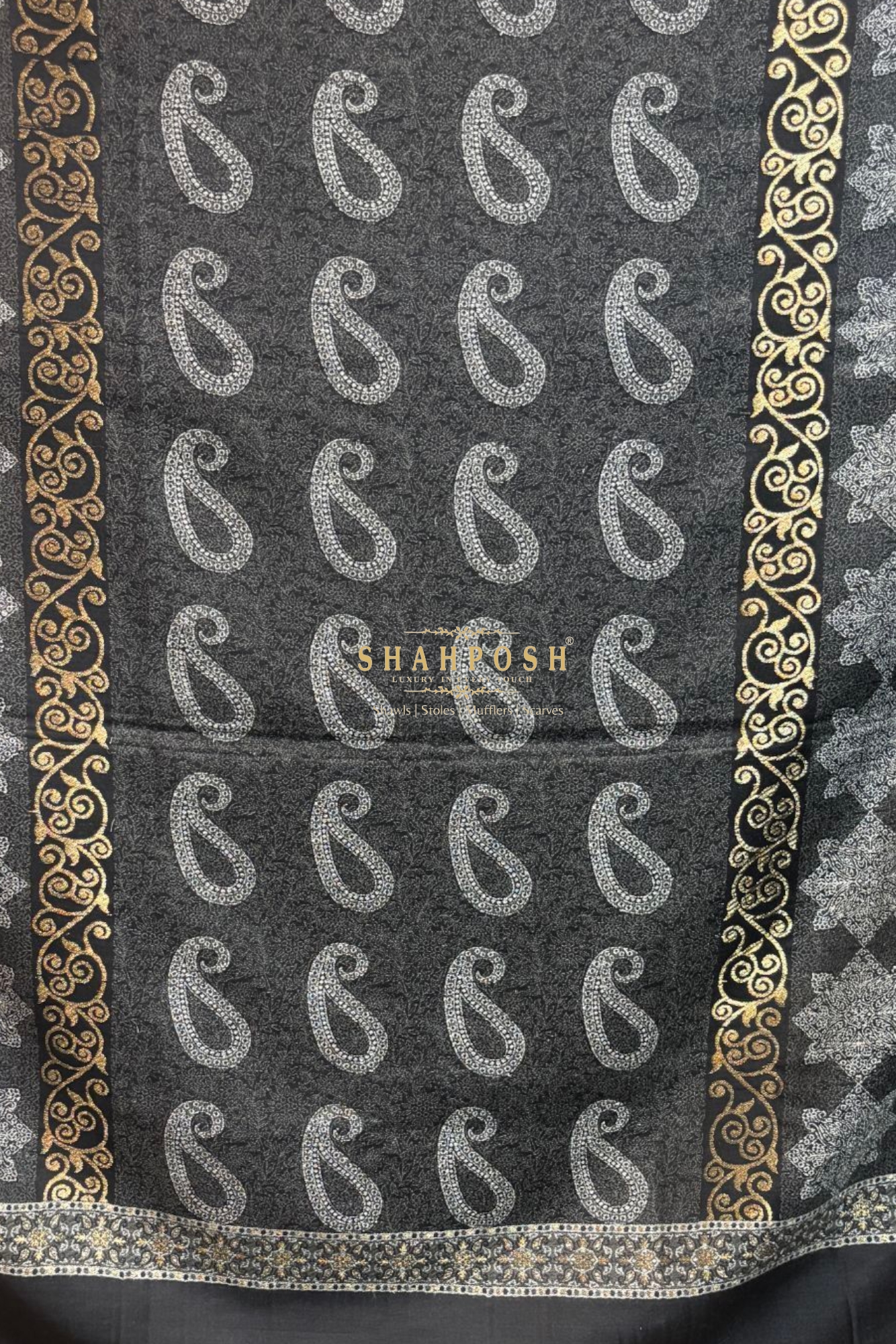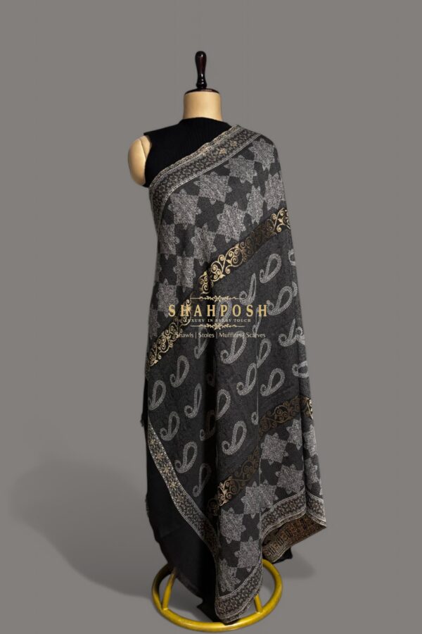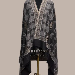 A stunning black Shahposh Jamawar Pashmina Women shawl adorned with intricate silver and gold patterns.The elegant paisley and floral motifs create a timeless, luxurious appeal. Soft, warm, and stylish, it’s perfect for any formal or casual occasion. Enhance your winter wardrobe with this exquisite and versatile piece.