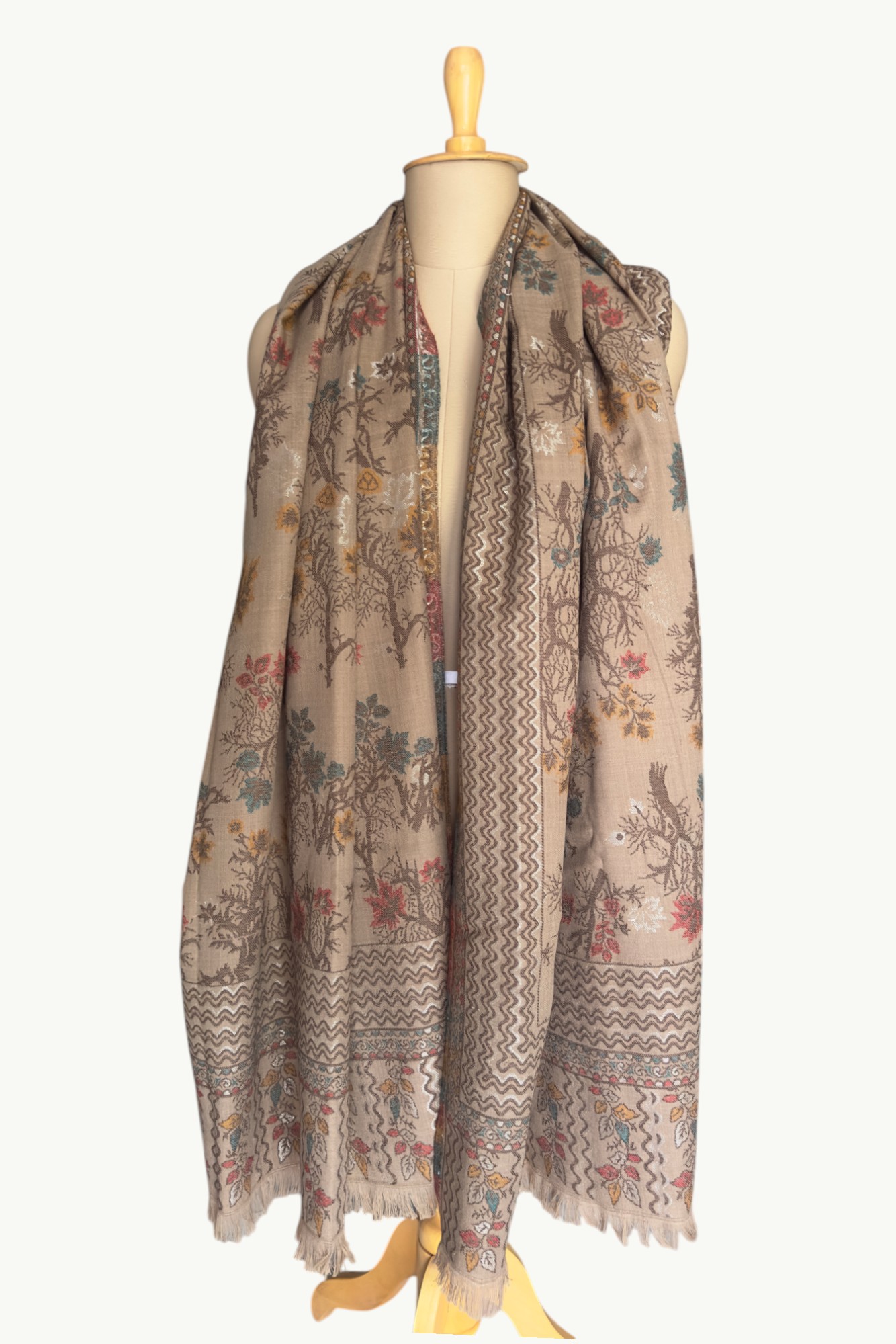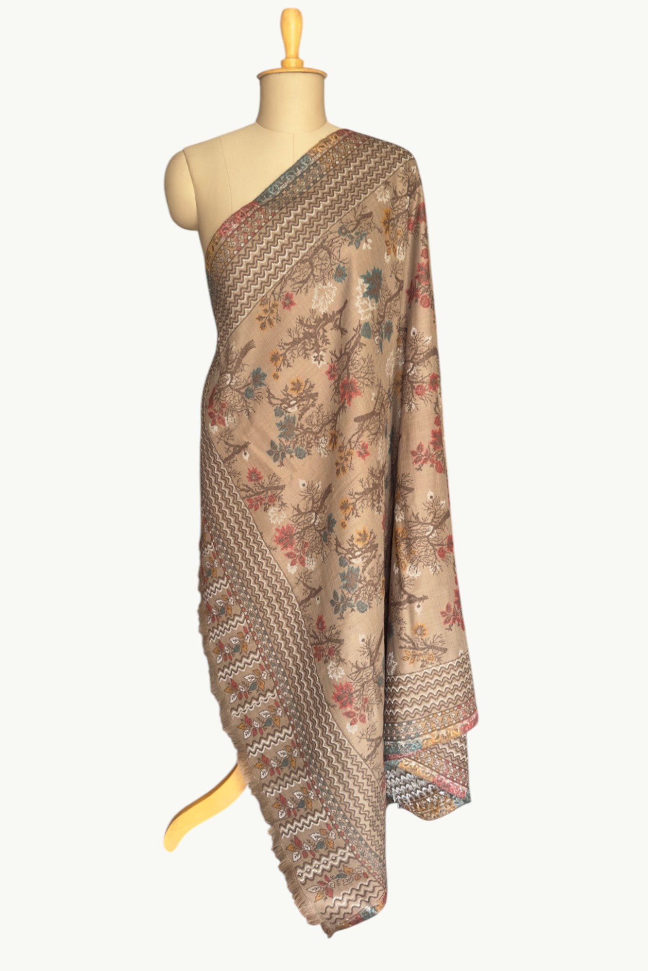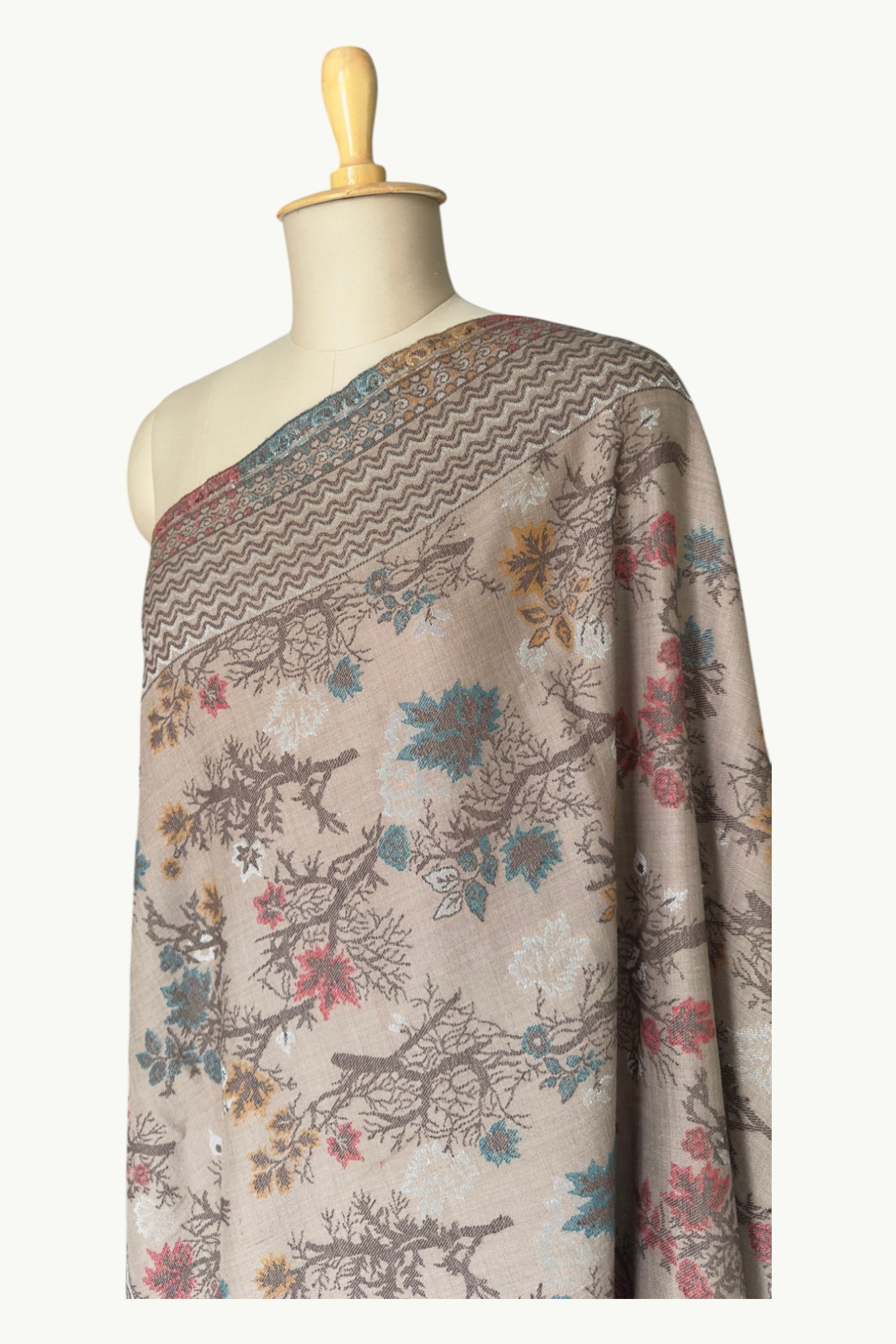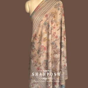 Elegant beige Shahposh Kani shawl adorned with intricate multicolor floral motifs and delicate geometric borders, exuding timeless sophistication.