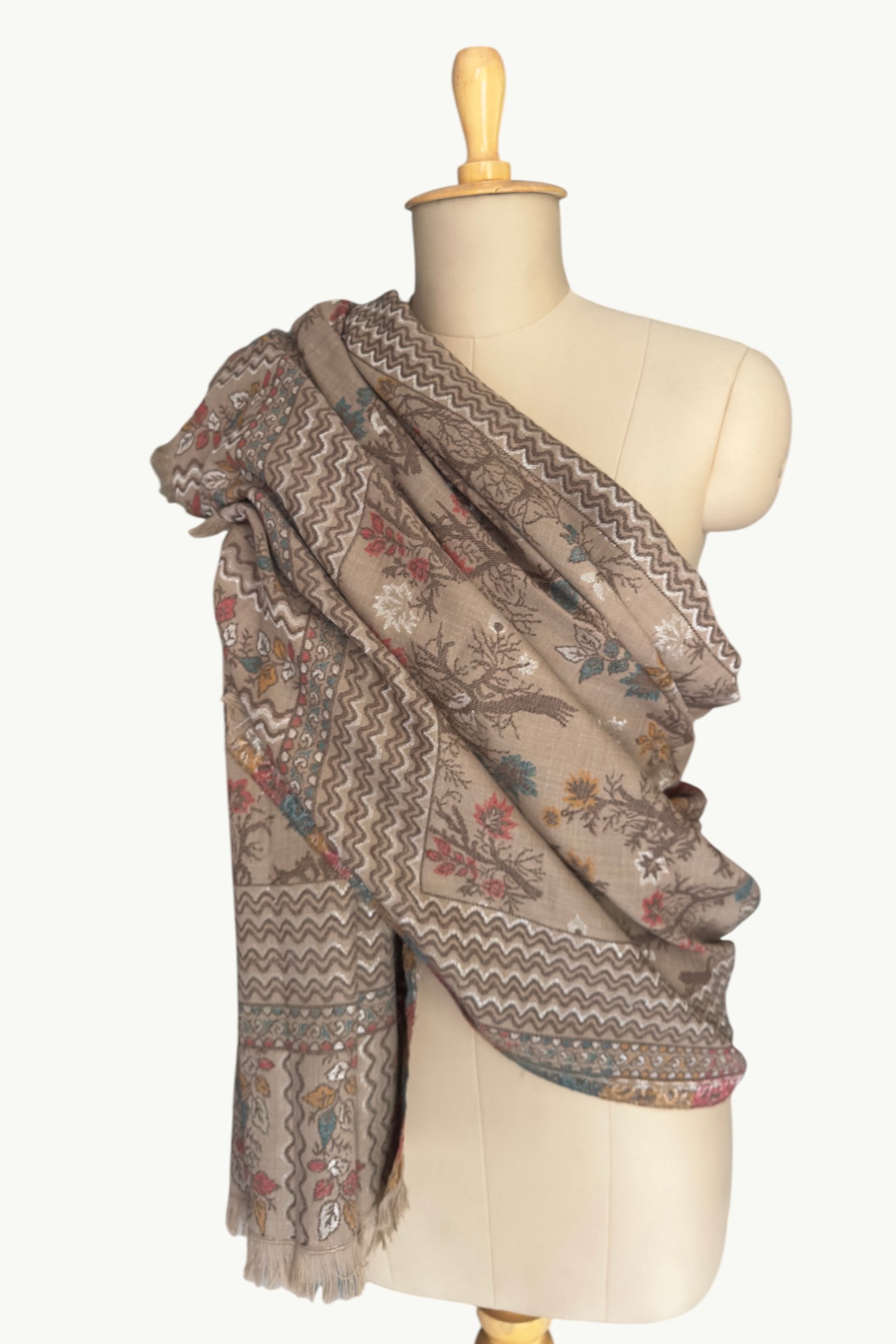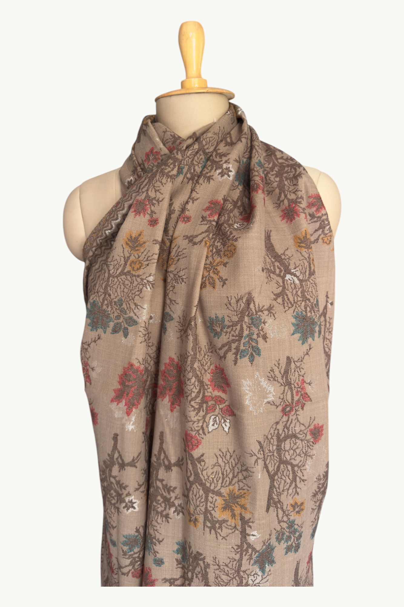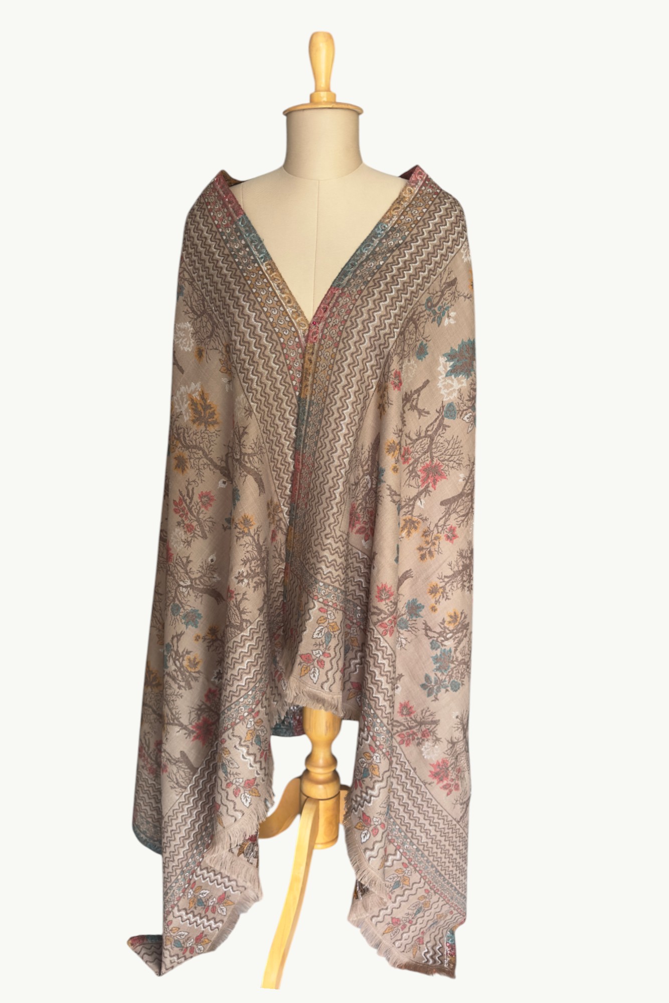 Elegant beige Shahposh Kani shawl adorned with intricate multicolor floral motifs and delicate geometric borders, exuding timeless sophistication.