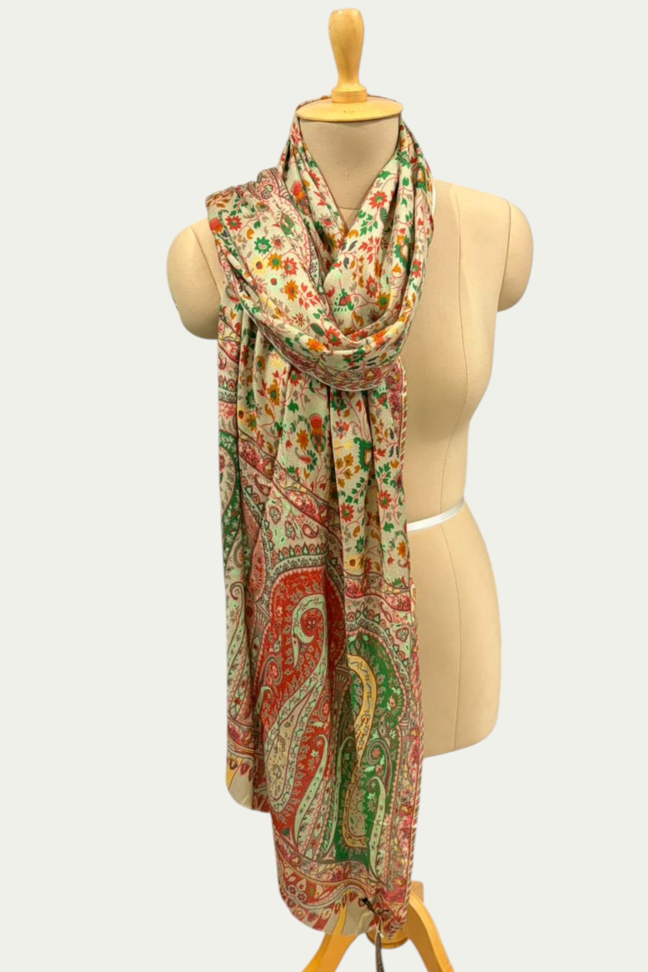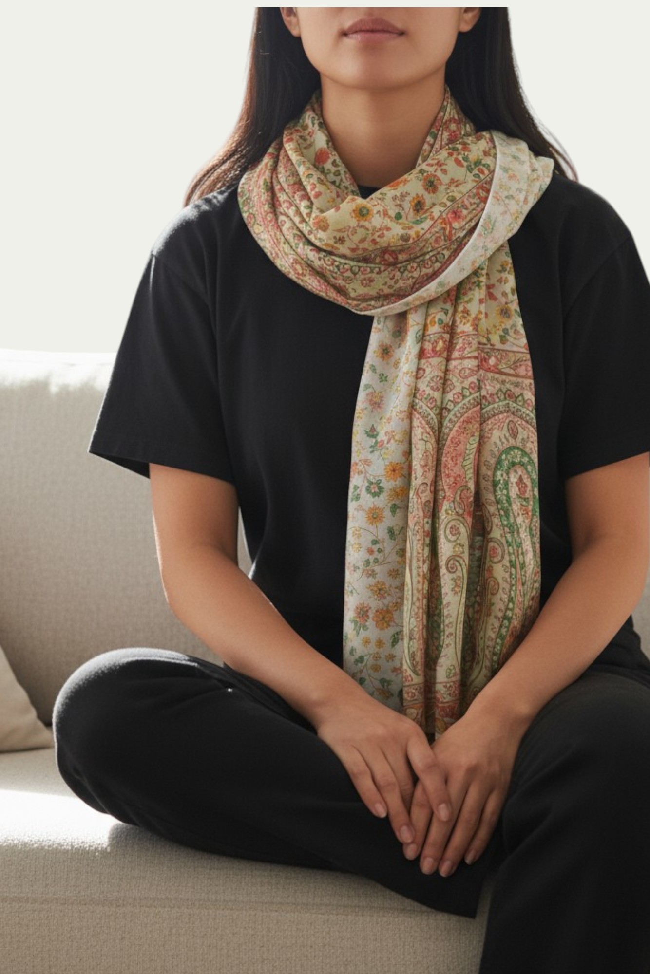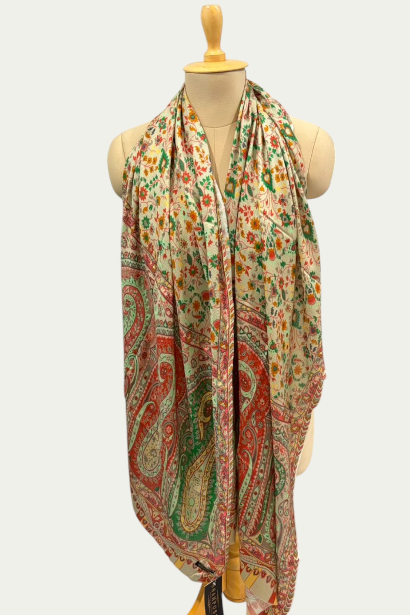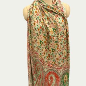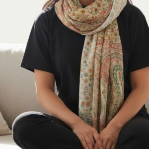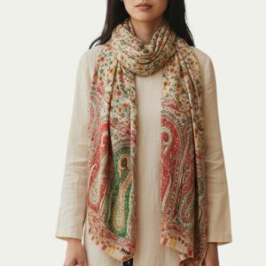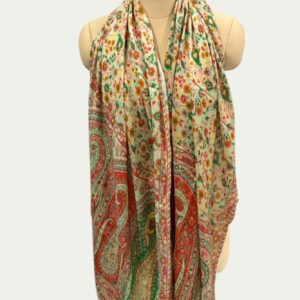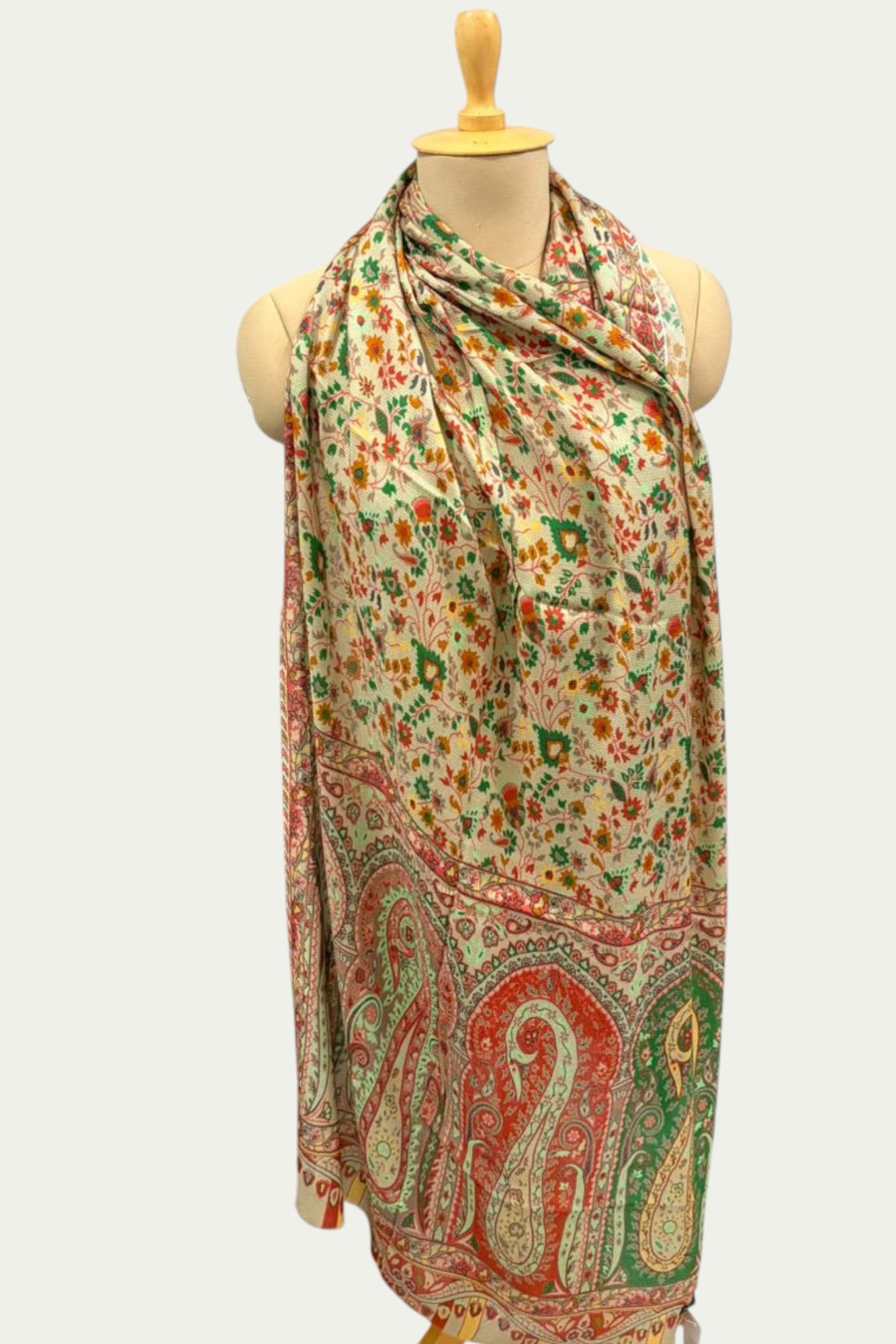 This elegant Shahposh stole features intricate floral printed Design  in red, green, and gold on a soft cream base. The delicate border design complements the rich patterns, making it a timeless and versatile accessory. It highlights the fine craftsmanship of the “SHAHPOSH” collection.