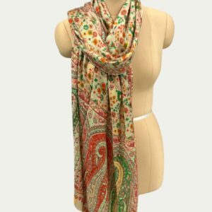 Be the first to review “This beautiful Stole features delicate printed Designed in red, green, and gold on a cream base.”