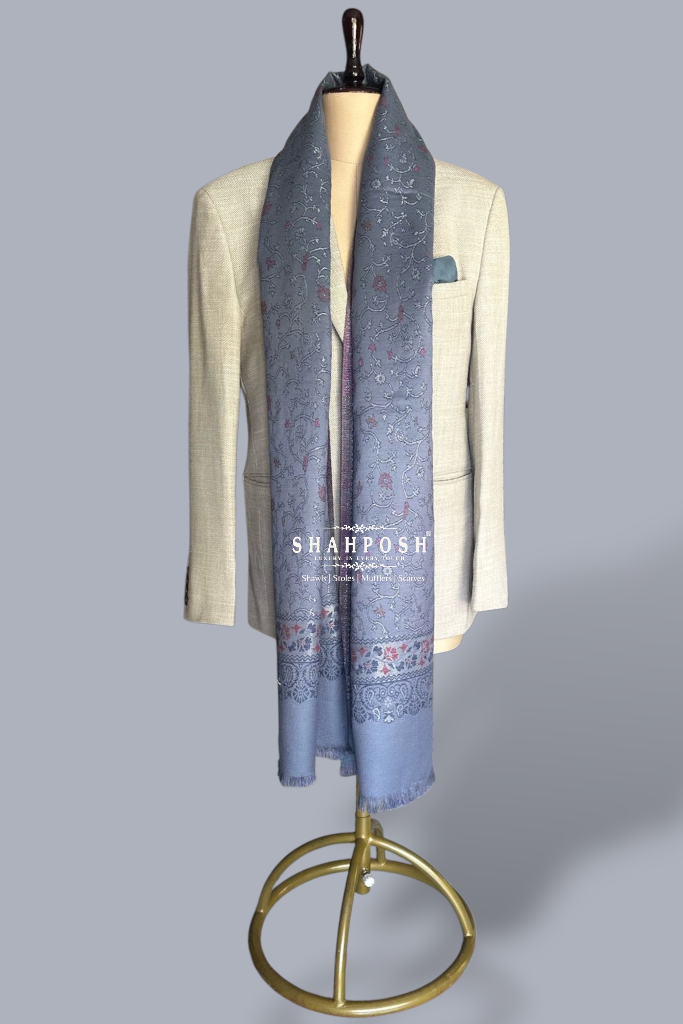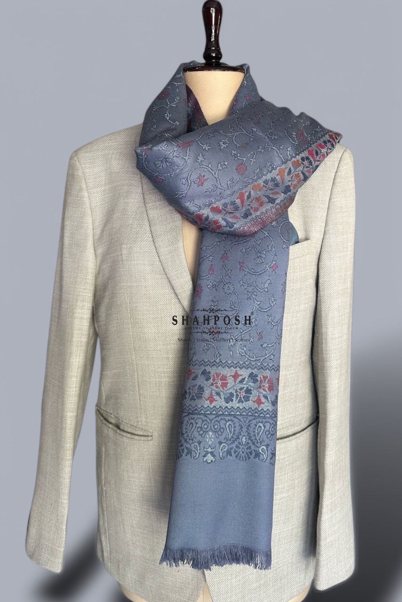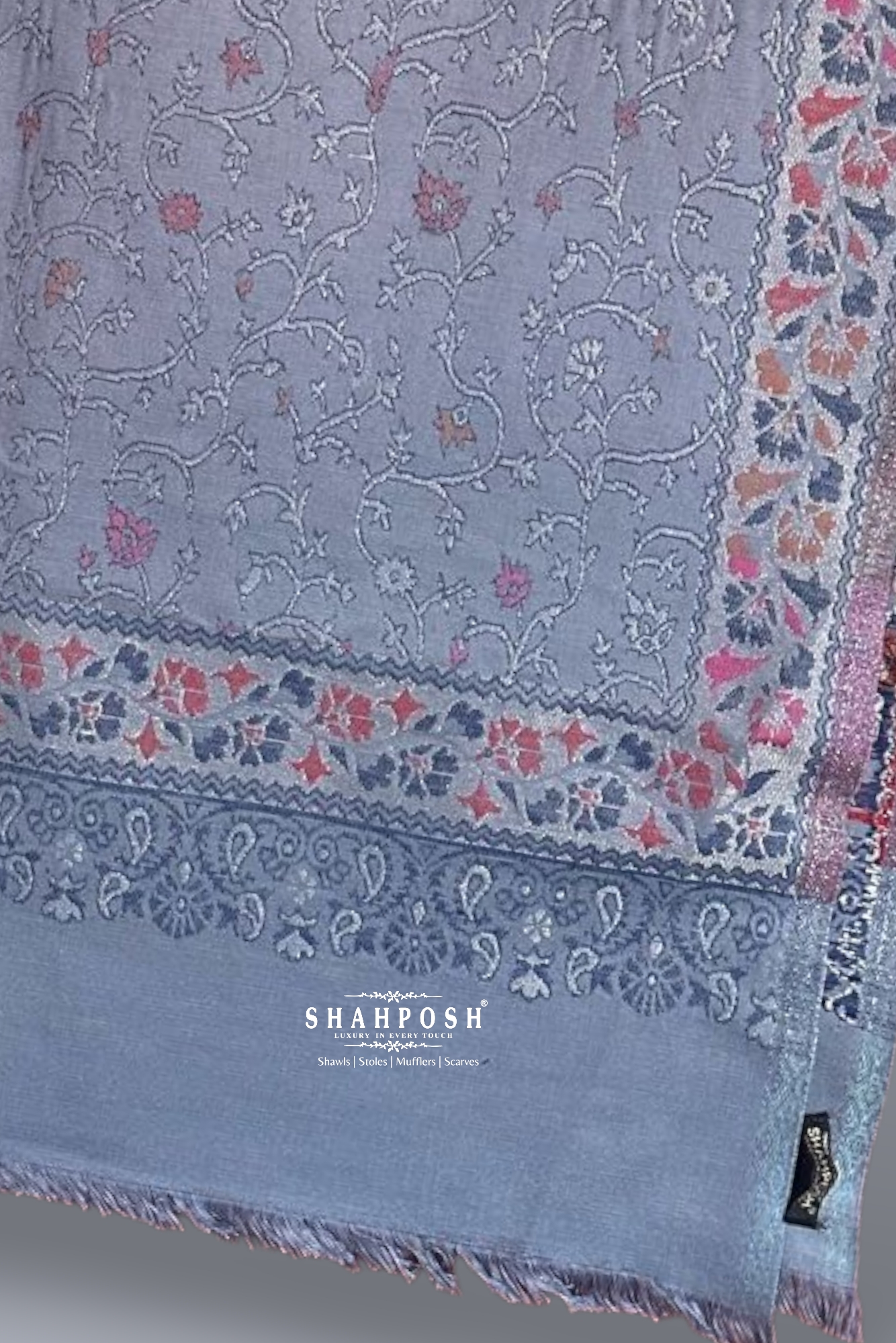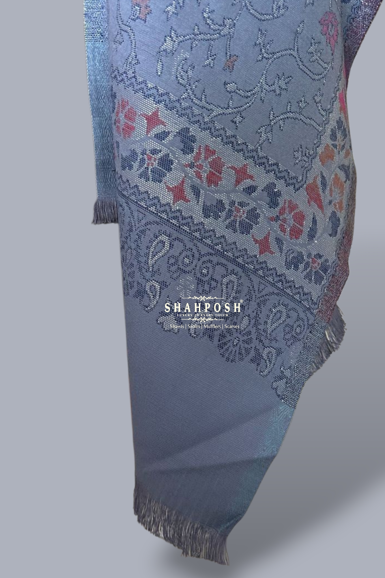 A Blue Shahposh Viscose Pashmina Jamawar Stole has a subtle, intricate woven pattern in shades of blue and hints of other colors, suggesting a high level of craftsmanship. The presence of Pashmina for fine quality and softness, combined with the jacquard woven detailing.