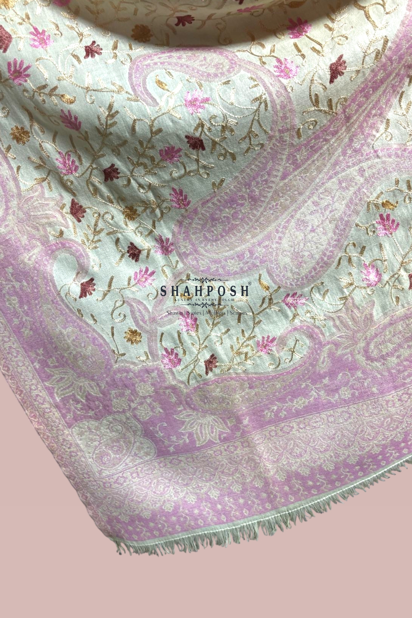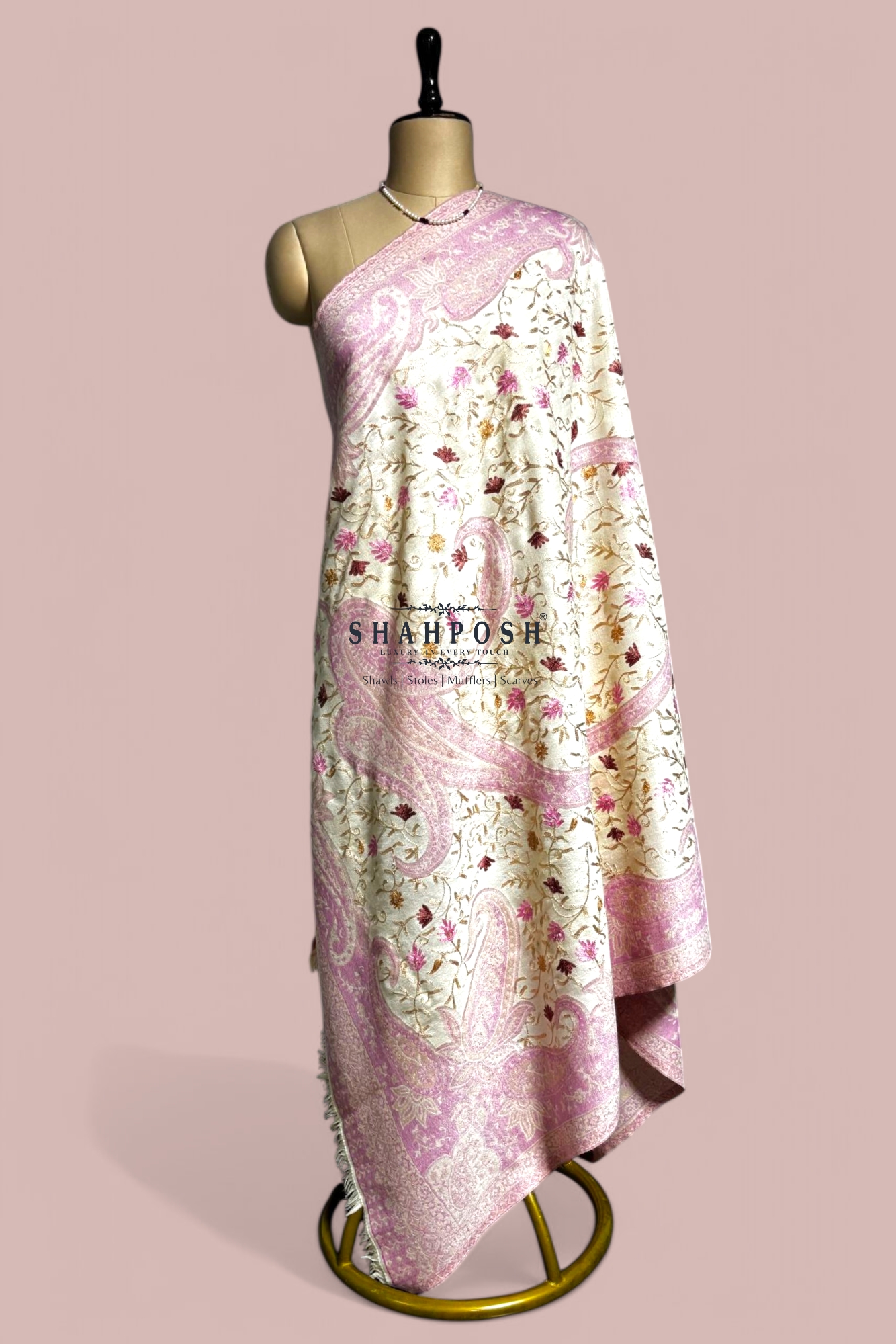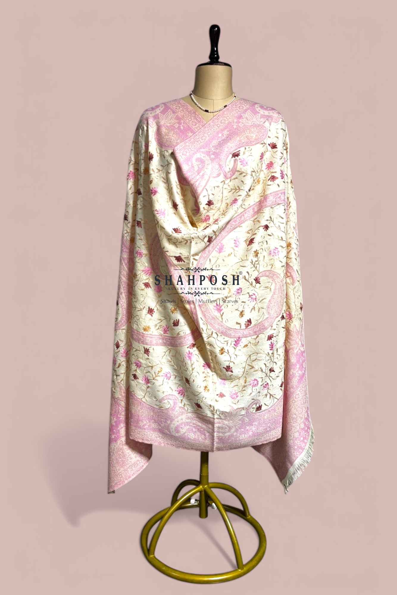 The Shahposh Woolen Blend Pashmina Jamawar shawl features a delicate floral pattern on a cream-colored base, accented with intricate pink borders that have paisley embroidery and traditional motifs. The fine detailing and craftsmanship highlight its elegance.